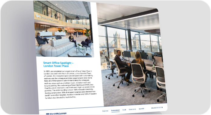 Smart O昀케ce Spotlight – London Tower Place In 2022, we completed our largest smart office at Tower Place in London. Located in the heart of London, across from the Tower of London, the renovated space was designed with sustainability, wellness and the colleague and client experience in mind. Some features of the space include sit/stand desks for colleagues, wellness areas such as a mothers’ room, reflection room and bicycle parking. We used energy efficient lighting and HVAC, low- flow fixtures in restrooms and eliminated single-use plastics in the pantries. The entire building runs on 100% renewable electricity. During construction, 98% of stripped materials were diverted from landfill and either recycled, reused or donated and 100% of reusable furniture was donated to local charities. Overview Environment Social Governance Appendix 2022 ESG REPORT 16