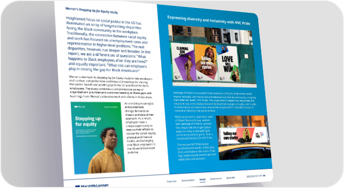 Mercer’s Stepping Up for Equity study Expressing diversity and inclusivity with NYC Pride Heightened focus on social justice in the US has illuminated an array of longstanding disparities facing the Black community in the workplace. Traditionally, the connection between racial equity and work has focused on unemployment rates and representation in higher-level positions. The real disparities, however, run deeper and broader. In this report, we ask a di昀昀erent set of questions: “What happens to Black employees after they are hired?” and equally important, “What role can employers play in closing the gap for Black Americans?” Mercer undertook its Stepping Up for Equity study to help employers craft a clear, comprehensive and impactful roadmap for closing the career, health and wealth gaps in the US workforce for Black employees. The study combines a comprehensive survey of Heritage of Pride is a non-profit that produces LGBTQIA+ Pride events which organizations’ practices and outcomes bearing on these gaps with inspire, educate, commemorate and celebrate our diverse community, including learnings from Mercer’s extensive work with clients in these areas. the trademark event, NYC Pride. The organization’s leadership recognized that Accelerating meaningful the event had an inconsistent brand identity that changed annually, and in order and sustainable to drive equity and awareness around the organization’s incredible impact, it change demands an needed an identity that would endure. impact- and data-driven Working pro bono, Lippincott, part approach. As a result, of Oliver Wyman Group, worked employers have a with Heritage of Pride to uncover unique opportunity to the unique role the organization step up their efforts to plays for many in the LGBTQIA+ deliver the career equity, community and bring it to life in a physical and financial new brand identity for NYC Pride. health, and belonging that Black employees in The evolved NYC Pride brand the US workforce need launched to the world in February to thrive. 2022, and features the iconic Pride flag, capturing the brand’s spirit of celebration and activism. Overview Environment Social Governance Appendix 2022 ESG REPORT 44