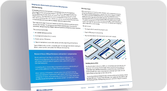 Helping our clients build and evaluate ESG programs ESG Pulse Check ESG Risk Rating ESG reporting is top-of-mind for leaders. However, with multiple ESG frameworks Embedding ESG into the business is increasingly a source of competitive and quickly developing regulations, it can be unclear where to begin. To address advantage for the companies that do it right. Marsh developed the ESG Risk this, Mercer and Marsh developed the ESG Pulse Check Assessment: for no Rating (ERR) tool to help clients self-assess the maturity of ESG within their additional, cost companies can evaluate where their ESG program stands today organizations. This free resource assists companies in measuring, managing, and what areas to focus on going forward. Unlike other assessments, this quick and communicating ESG risks. Clients can use the results to identify their most 12-question survey takes less than 10 minutes to complete. Helpful feedback and a critical climate and sustainability related risks and opportunities. custom-built plan for improvement are generated immediately upon completion, which help define a clear strategy. The output one-page “scorecard” based on a set of quantitative questions across Results include: 18 core ESG themes. The rating received differentiates between more than 60 industries, recognizing the different relative importance of themes across industries. • The organization’s overall ESG program score The scorecard provides: • Gaps in ESG program and planning 1. An overall rating (out of 10) • Key recommendations for improvement across each category 2. A component rating for E, S and G 3. Scores across 19 themes 4. Recommendations to consider across controls, reporting and resilience Type of clients who use this: corporate and risk management clients looking to better understand or articulate their ESG position/journey Research focus: ESG performance and workers’ compensation Marsh, with input from Mercer and Oliver Wyman colleagues, has begun to investigate possible correlations between ESG performance and risk performance using the granular data captured through our ESG Risk Rating tool. Building blocks of ESG Uncovering these relationships is expected to grow our understanding of Small and medium enterprises (SMEs) are increasingly required to develop and some of the additional levers that influence loss outcomes. grow their ESG strategy. Smaller organizations may not have the budgets to undertake highly detailed assessments, so Marsh Advisory created the ESG When looking at US workers’ compensation data we found a strong Building Blocks tool, which allows clients to undertake high-impact, low-cost correlation between organizations with higher social scores (in the ERR options that can help them on their ESG journey. categories of social, social (controls), community and vitality, dignity and The Building Blocks are designed to be an end-to-end ESG service allowing clients to equality) experiencing fewer, less severe workers’ compensation losses. tell their ESG story. The tool breaks ESG down into modular activities which include ESG Strategy Builder, ESG Reporting framework and ESG Risk Register framework. Overview Environment Social Governance Appendix 2022 ESG REPORT 62