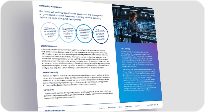 Vulnerability management Our robust vulnerability identi昀椀cation, assessment and management program includes system hardening, scanning, alerting, operating system and application patch management Track, assess and Static and dynamic External penetration Patch systems remediate security security application tests of our systems regularly and track, vulnerabilities and testing is a core and applications assess for risk, emerging threats capability of our and continuous test and deploy according to risk software monitoring our patches or hot development external attack fixes to known priority lifecycle surface vulnerabilities Incident response Data Privacy A dedicated problem management team support our Unified Incident Response process for Marsh McLennan has a designated Global Chief both cybersecurity and privacy matters. This process assists the company’s Global Technology Privacy Officer who manages our global Privacy Infrastructure support teams in performing problem analysis and troubleshooting to determine team. The Global Privacy Team includes a network of the root cause of one or more incidents. The problem management process is based around dedicated Privacy Officers across various regions and Information Technology Infrastructure Library (ITIL) standards and includes development and businesses, a European Data Protection Officer and production of corrective actions plans and post-mortem reports. Depending on scope and scale, dozens of data protection coordinators across the corrective actions are prioritized as changes (following the change management process), service globe who are responsible for privacy matters in their improvement programs or formal IT projects. In the case of a data breach, we are committed to respective jurisdictions. notifying data subjects in a timely manner, in accordance with local laws and regulations. The Privacy Team is responsible for administering our Network security Privacy Program and overseeing the proper handling To meet our rigorous confidentiality, integrity and availability standards, we have in place a and use of personal information across the company. Secure Access Service Edge (SASE) architecture and a defense-in-depth approach leveraging The team works closely with IT, Information Security, the MITRE ATT&CK framework to test how our environment responds to a variety of threat Human Resources and various other functional tactics. We are actively implementing a multi-year zero-trust architecture strategy which groups in this effort. We have an established process includes workload segmentation and network access control solutions. for conducting risk-based privacy assessments for new products, services and IT initiatives that includes Compliance a review of technical, administrative and physical safeguards in order to comply with applicable Marsh Compliance with business and regulatory requirements like GLB, GDPR, HIPAA, NYDFS, CCPA and McLennan policies and regulatory regimes. Sarbanes-Oxley are assessed through internal and external audits performed on a risk basis. Senior management is updated on the outcomes. Overview Environment Social Governance Appendix 2022 ESG REPORT 55
