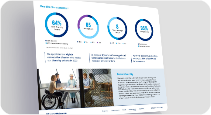 Key director statistics* 64% 65 8 93% Meet Diversity Average Age Years Average Independent Criteria Tenure 36% Women 40s 50s 60s 70s 0-6 7-14 15+ Independent 29% Racial/Ethnic diversity Not independent *Key Director Statistics are as of May 18, 2023 We appointed our eighth In the past 5 years, we have appointed As of our 2023 annual meeting, consecutive director who meets 5 independent directors, all of whom we expect 36% of our board our diversity criteria in 2023 meet our diversity criteria to be women Board diversity Marsh McLennan has a strong history of Board diversity. Our first woman director, Adele Smith Simmons, joined the Board in 1978. Ms. Simmons served as the first chair of the Corporate Responsibility Committee of our Board, which was the predecessor to our Board ESG Committee and served as a foundation for today’s ESG initiatives. We are committed to maintaining an inclusive and diverse Board, and our first director meeting our racial and ethnic diversity criteria was appointed in 1998. Of the fourteen directors standing for re-election at our 2023 annual meeting, four are men who are racially or ethnically diverse and five are women. Overview Environment Social Governance Appendix 2022 ESG REPORT 47