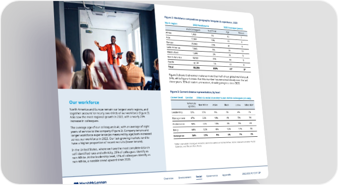 Figure 2: Workforce composition: geographic footprint & experience, 2022 Work region 2022 Headcounts 2022 Averages (years) # of Colleagues % of Total Age Tenure Africa 1,060 1% 43 7 Asia 17,081 19% 35 4 Europe 25,842 29% 41 9 Latin America 7,865 9% 39 11 Middle East 1,690 2% 46 5 North America 30,581 35% 44 9 Paci昀椀c 4,139 5% 43 8 Total 88,258 100% 41* 8* Figure 3 shows that women make up more than half of our global workforce at 54%, while Figure 4 shows that this number has remained steady over the last three years. 32% of leaders are women, showing progress since 2020. Figure 3: Current diverse representation, by level Career level Gender Ethnic & racial diversity: % non-White colleagues (US only) Our workforce % Female Non-White Asian Black Latinx Other NW* (global) North America and Europe remain our largest work regions, and together account for nearly two-thirds of our workforce (figure 2). Leadership 32% 17% 9% 2% 4% 2% Asia saw the most regional growth in 2022, with a nearly 20% Management 47% 22% 10% 4% 5% 3% increase in colleagues. The average age of our colleagues is 41, with an average of eight Professional 58% 30% 10% 8% 9% 4% years of service to the company (Figure 2). Company tenure and Entry 64% 32% 6% 12% 11% 4% longer workforce experience (as measured by age) both increased Enterprise 54% 25% 9% 6% 7% 3% across our workforce in 2022. Our fast-growing markets tend to have a higher proportion of recent recruits (lower tenure). In the United States, where we have the most complete data on * Other non-white colleagues includes: American Indian or Alaska Native, Native Hawaiian or Other Paci昀椀c Islander, and Two or More Races. self-identified race and ethnicity, 25% of colleagues identify as non-White. At the leadership level, 17% of colleagues identify as non-White, a notable trend upward since 2020. Overview Environment Social Governance Appendix 2022 ESG REPORT 27