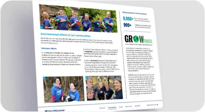 Doing our part for the environment hours volunteered with 9,000+ environmental non-profits 900+ colleagues volunteered with environmental non-profits 1. Environmental e昀昀orts in our communities Marsh McLennan’s more than 85,000 colleagues have the collective power to be a force for good. Around the world, our colleagues are bettering their communities and the future of our planet by volunteering for environmental causes. Oliver Wyman’s GROWTrees initiative is a Volunteer e昀昀orts 2. During Global Volunteer Month in May, colleagues philanthropic reforestation program focused in Argentina planted trees and removed 40 bags of on informing and engaging colleagues in 1. Colleagues in the UK volunteered at the trash from part of the North Ecological Reserve in tree planting and restoration. Partnering Kedlestone Community Centre which includes multiple Parque Natural Municipal. with the nonprofit, One Tree Planted, other community gardens, two orchards, and hundreds of local charities, and Climate Impact Partners’ individual and communal beds. The group completed 3. Marsh Australia donated 17,000 seedlings to Million Mangroves Project, the program a variety of tasks including planting seedlings, non-profit organization Planet Ark to assist in supports reforestation and restoration weeding flowerbeds and repairing wooden planters. creating a greener future. On July 31, colleagues projects that protect wildlife, promote across Australia participated in National Tree food and water security, support indigenous Planting Day, helping to plant nearly 3,000 of those communities and improve long term seedlings through several different events. climate resilience. 2. 3. GROWTrees launched with the gift of a tree for every Oliver Wyman colleague, with an invitation to vote where the tree would be planted. Since then, teams have donated trees on behalf of clients, planted trees through hands-on community volunteering, given away tree donations at events to promote sustainability in place of ‘swag’, or used the program as a way to acknowledge fellow colleagues for a job well done. Overview Environment Social Governance Appendix 2022 ESG REPORT 18