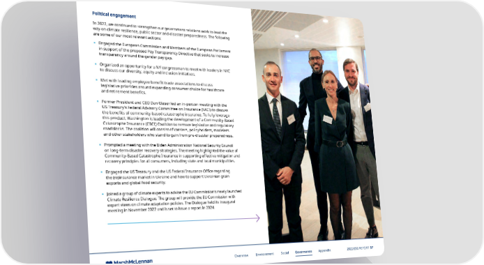 Political engagement In 2022, we continued to strengthen our government relations work to lead the way on climate resilience, public sector and disaster preparedness. The following are some of our most relevant actions: • Engaged the European Commission and Members of the European Parliament in support of the proposed Pay Transparency Directive that seeks to increase transparency around the gender pay gap. • Organized an opportunity for a NY congressman to meet with leaders in NYC to discuss our diversity, equity and inclusion initiatives. • Met with leading employee benefit trade associations to discuss legislative priorities around expanding consumer choice for healthcare and retirement benefits. • Former President and CEO Dan Glaser led an in-person meeting with the US Treasury’s Federal Advisory Committee on Insurance (FACI) to discuss the benefits of community-based catastrophe insurance. To fully leverage this product, Washington is leading the development of a Community-Based Catastrophe Insurance (CBCI) Coalition to remove legislative and regulatory roadblocks. The coalition will consist of carriers, policyholders, modelers and other stakeholders who stand to gain from pre-disaster preparedness. • Prompted a meeting with the Biden Administration National Security Council on long-term disaster recovery strategies. The meeting highlighted the value of Community-Based Catastrophe Insurance in supporting effective mitigation and recovery principles for all consumers, including state and local municipalities. • Engaged the US Treasury and the US Federal Insurance Office regarding the (re)insurance market in Ukraine and how to support Ukrainian grain exports and global food security. • Joined a group of climate experts to advise the EU Commission’s newly launched Climate Resilience Dialogue. The group will provide the EU Commission with expert views on climate adaptation policies. The Dialogue held its inaugural meeting in November 2022 and is set to issue a report in 2024. Overview Environment Social Governance Appendix 2022 ESG REPORT 57
