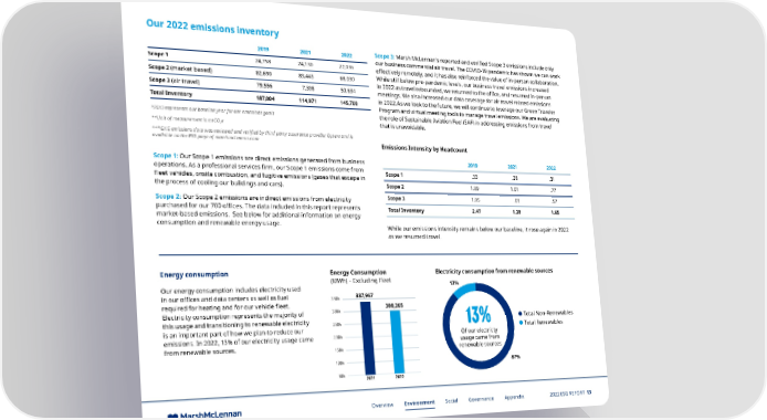 Our 2022 emissions inventory 2019 2021 2022 Scope 3: Marsh McLennan’s reported and verified Scope 3 emissions include only Scope 1 24,758 24,130 27,036 our business commercial air travel. The COVID-19 pandemic has shown we can work effectively remotely, and it has also reinforced the value of in-person collaboration. Scope 2 (market based) 82,690 83,443 68,030 While still below pre-pandemic levels, our business travel emissions increased Scope 3 (air travel) 79,556 7,398 50,634 in 2022 as travel rebounded, we returned to the office, and resumed in-person meetings. We also increased our data coverage for air travel related emissions Total Inventory 187,004 114,971 145,700 in 2022.As we look to the future, we will continue to leverage our Green Traveler Program and virtual meeting tools to manage travel emissions. We are evaluating *2019 represents our baseline year for our emissions goals the role of Sustainable Aviation Fuel (SAF) in addressing emissions from travel **Unit of measurement is mtCO e that is unavoidable. 2 ***GHG emissions data was reviewed and veri昀椀ed by third party assurance provider Optera and is available on the ESG page of marshmclennan.com Emissions Intensity by Headcount Scope 1: Our Scope 1 emissions are direct emissions generated from business 2019 2021 2022 operations. As a professional services firm, our Scope 1 emissions come from Scope 1 .33 .28 .31 fleet vehicles, onsite combustion, and fugitive emissions (gases that escape in the process of cooling our buildings and cars). Scope 2 1.09 1.01 .77 Scope 2: Our Scope 2 emissions are indirect emissions from electricity Scope 3 1.05 .09 .57 purchased for our 700 offices. The data included in this report represents Total Inventory 2.47 1.38 1.65 market-based emissions. See below for additional information on energy consumption and renewable energy usage. While our emissions intensity remains below our baseline, it rose again in 2022 as we resumed travel. Energy consumption Energy Consumption Electricity consumption from renewable sources (MWh) – Excluding Fleet 13% Our energy consumption includes electricity used in our offices and data centers as well as fuel 350k 337,967 required for heating and for our vehicle fleet. 300,265 Electricity consumption represents the majority of 300k this usage and transitioning to renewable electricity Total Non-Renewables is an important part of how we plan to reduce our 250k 13% Total Renewables emissions. In 2022, 13% of our electricity usage came 200k Of our electricty from renewable sources. usage came from 150k renewable sources 100k 87% 50k 2021 2022 Overview Environment Social Governance Appendix 2022 ESG REPORT 13