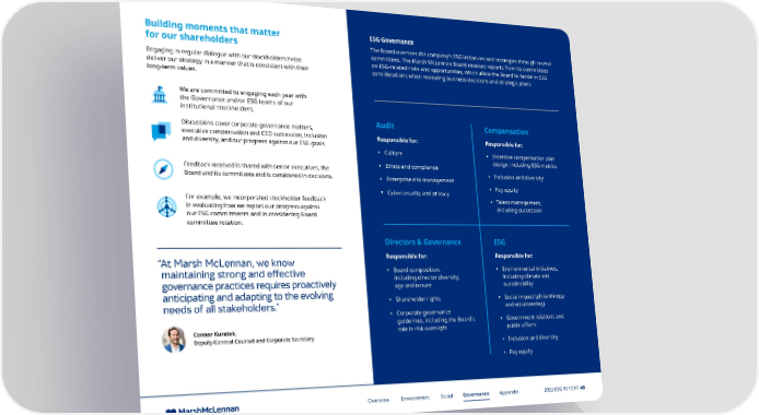 Building moments that matter ESG Governance for our shareholders The Board oversees the company’s ESG initiatives and strategies through several committees. The Marsh McLennan Board receives reports from its committees Engaging in regular dialogue with our stockholders helps on ESG-related risks and opportunities, which allow the Board to factor in ESG deliver our strategy in a manner that is consistent with their considerations when reviewing business decisions and strategic plans. long-term values. We are committed to engaging each year with the Governance and/or ESG teams of our institutional stockholders. Discussions cover corporate governance matters, Audit Compensation executive compensation and CEO succession, inclusion Responsible for: Responsible for: and diversity, and our progress against our ESG goals. • Culture • Incentive compensation plan • Ethics and compliance design, including ESG metrics Feedback received is shared with senior executives, the • Inclusion and diversity Board and its committees and is considered in decisions. • Enterprise risk management • Cybersecurity and privacy • Pay equity For example, we incorporated stockholder feedback • Talent management, in evaluating how we report our progress against including succession our ESG commitments and in considering Board committee rotation. Directors & Governance ESG “At Marsh McLennan, we know Responsible for: Responsible for: • Board composition, • Environmental initiatives, maintaining strong and e昀昀ective including director diversity, including climate and governance practices requires proactively age and tenure sustainability anticipating and adapting to the evolving • Shareholder rights • Social impact (philanthropy needs of all stakeholders.” and volunteering) • Corporate governance guidelines, including the Board’s • Government relations and Connor Kuratek, role in risk oversight public affairs Deputy General Counsel and Corporate Secretary • Inclusion and diversity • Pay equity Overview Environment Social Governance Appendix 2022 ESG REPORT 48