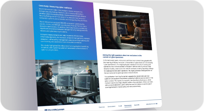 Case study: Measuring cyber resilience Marsh McLennan’s Cyber Risk Analytics Center analyzed the BitSight Security Ratings Platform, which helps underwriters develop cyber insurance policies. Boston-based BitSight offers a Security Rating and 13 “risk vectors” to measure how many of a company’s systems are vulnerable and how quickly they are fixed. Marsh McLennan analyzed 365,000 companies’ cybersecurity events, claims, and BitSight security data. Poor performers were linked to cyberattacks. In addition, the study found a statistically significant association between BitSight Security Ratings and risk vectors and cybersecurity incidents. BitSight’s measurements can help insurance officials make informed judgments. For example, endpoint management, malware detection, vulnerability management, secure communications, and user training and awareness have measured correlation. Our study highlighted the relevance of an organization’s patching initiatives, with “patching cadence” associated to the chance of a cybersecurity incident. Asking the right questions about war exclusions in the context of cyber operations In the last several years, reinsurance and insurance markets have grappled with the meaning of the war exclusion in the context of cyberattacks (or more broadly, “cyber operations”). The ongoing Russian invasion of Ukraine, including cyber operations that crashed websites of Ukraine’s defense ministry and two large Ukrainian banks, underscores the need for contract certainty regarding coverage for state-sponsored cyber operations. Yet, legal guidance on the application of the war exclusion to cyber operations remains elusive. This publication from Guy Carpenter suggests that stakeholders ask new questions and explains the problems posed by traditional war exclusions in the cyber context. The report also explains how recently drafted clauses, which markets have increasingly adopted, address these problems. It then considers reinsurance implications, particularly the need for cedents to avoid a gap of coverage between original policy and reinsurance treaty. Overview Environment Social Governance Appendix 2022 ESG REPORT 60