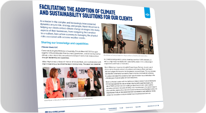 Facilitating the adoption of climate and sustainability solutions for our clients As a leader in the complex and increasingly interconnected dynamics around risk, strategy, and people, Marsh McLennan is helping our clients embed climate change strategies into many aspects of their businesses, from navigating the transition to a resilient, low-carbon economy to managing the physical risks associated with extreme weather events. Sharing our knowledge and capabilities Climate Week NYC Convened during the UN General Assembly, Climate Week NYC 2022 brought together influential leaders from business, government, and civil society to drive climate action. Marsh McLennan hosted a range of events that showcased our Marsh McLennan hosting a discussion on the pros and cons of avoidance and removal o昀昀sets. thought leadership and capabilities. in a livestreamed panel discussion viewed by more than 10,000 attendees, as Oliver Wyman was a Research Partner of Climate Week, and in collaboration with well as a high-level roundtable with sustainability leaders from a wide range of the Climate Group, launched the report Getting Going. The paper was presented corporations and financial institutions. Marsh McLennan, in partnership with Climate Impact Partners, hosted a panel discussion on the pros and cons of avoidance and removal offsets and how to allocate budget and resources for the greatest value and impact. The key takeaway was that the conversation we need to have is not about removals OR avoidance, it is about removals AND avoidance. Each type of solution has a role to play in the ultimate goal of overall global emission reductions. Marsh co-hosted a panel with the Taskforce on Nature-related Financial Disclosures (TNFD) that explored the nature-related risks that will impact the industry, the role of TNFD to inform decision-making to divert investment in nature positive economy and boost innovative-thinking in the insurance space. Our panel of experts discussed the urgency for action to halt and reverse nature and biodiversity loss, the importance of nature risks assessments for businesses to build resilience, the key drivers for innovation in nature-related insurance products and services. Oliver Wyman colleagues participated in a panel discussion during Climate Week NYC. Overview Environment Social Governance Appendix 2022 ESG REPORT 19