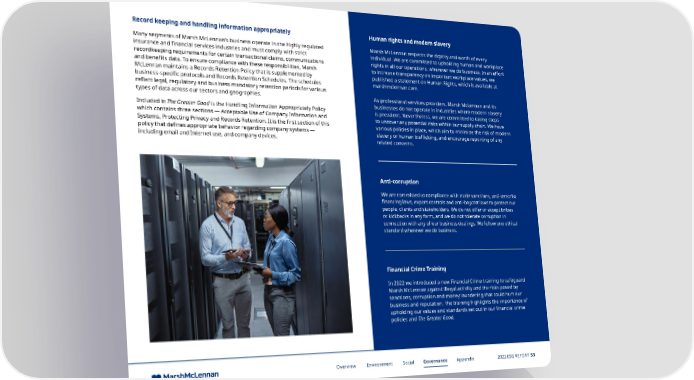 Record keeping and handling information appropriately Human rights and modern slavery Many segments of Marsh McLennan’s business operate in the highly regulated Marsh McLennan respects the dignity and worth of every insurance and financial services industries and must comply with strict individual. We are committed to upholding human and workplace recordkeeping requirements for certain transactional claims, communications rights in all our operations, wherever we do business. In an effort and benefits data. To ensure compliance with these responsibilities, Marsh to increase transparency on important workplace values, we McLennan maintains a Records Retention Policy that is supplemented by published a statement on Human Rights, which is available at business-specific protocols and Records Retention Schedules. The schedules marshmclennan.com. reflect legal, regulatory and business mandatory retention periods for various types of data across our sectors and geographies. As professional services providers, Marsh McLennan and its Included in The Greater Good is the Handling Information Appropriately Policy businesses do not operate in industries where modern slavery which contains three sections — Acceptable Use of Company Information and is prevalent. Nevertheless, we are committed to taking steps Systems, Protecting Privacy and Records Retention. It is the first section of this to uncover any potential risks within our supply chain. We have policy that defines appropriate behavior regarding company systems — various policies in place, which aim to minimize the risk of modern including email and Internet use, and company devices. slavery or human trafficking, and encourage reporting of any related concerns. Anti-corruption We are committed to compliance with trade sanctions, anti-terrorist financing laws, export controls and anti-boycott laws to protect our people, clients and stakeholders. We do not offer or accept bribes or kickbacks in any form, and we do not tolerate corruption in connection with any of our business dealings. We follow one ethical standard wherever we do business. Financial Crime Training In 2022 we introduced a new Financial Crime training to safeguard Marsh McLennan against illegal activity and the risks posed by sanctions, corruption and money laundering that could hurt our business and reputation. The training highlights the importance of upholding our values and standards set out in our financial crime policies and The Greater Good. Overview Environment Social Governance Appendix 2022 ESG REPORT 53