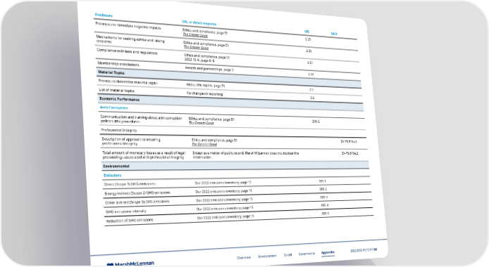 Disclosure URL or direct response GRI SASB Processes to remediate negative impacts Ethics and compliance, page 51 2-25 The Greater Good Mechanisms for seeking advice and raising Ethics and compliance, page 51 2-26 concerns The Greater Good Compliance with laws and regulations Ethics and compliance, page 51 2-27 2022 10-K, page 8–9 Membership associations Awards and partnerships, page 7 2-28 Material Topics Process to determine material topics About this report, page 71 3-1 List of material topics No changes in reporting 3-2 Economic Performance Anti-Corruption Communication and training about anti-corruption Ethics and compliance, page 51 205-2 policies and procedures The Greater Good Professional Integrity Description of approach to ensuring Ethics and compliance, page 51 SV-PS-510a.1 professional integrity The Greater Good Total amount of monetary losses as a result of legal Except as a matter of public record, Marsh McLennan does not disclose this SV-PS-510a.2 proceedings associated with professional integrity information. Environmental Emissions Direct (Scope 1) GHG emissions Our 2022 emissions inventory, page 13 305-1 Energy indirect (Scope 2) GHG emissions Our 2022 emissions inventory, page 13 305-2 Other indirect (Scope 3) GHG emissions Our 2022 emissions inventory, page 13 305-3 GHG emissions intensity Our 2022 emissions inventory, page 13 305-4 Reduction of GHG emissions Our 2022 emissions inventory, page 13 305-5 Overview Environment Social Governance Appendix 2022 ESG REPORT 66
