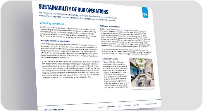 Sustainability of our operations We recognize the importance of carefully controlling the e昀昀ects of our business on the environment, especially as a multinational 昀椀rm operating in more than 130 countries. Making our o昀케ces smarter Greening our o昀케ces Our offices provide a great opportunity for environmental stewardship and Building a future of work focused on a sense of community and connection, our colleague engagement. We have a number of initiatives focused on reducing Smart Office program was introduced in 2016 by Marsh McLennan’s Real Estate the impact of our spaces that address aspects of the real estate life cycle Services division to promote collaboration, productivity and innovation, while including site selection, site construction and fit-out, and day-to-day operations. reducing our environmental impact. The Smart Office concept features creative Where possible, we seek to lease space in green certified buildings. interior design and cutting-edge technology to support new digitized workflows and a hybrid work environment. Combining a reduced real estate footprint and increased Managing technology sustainably space utilization with waste-reducing construction practices and energy-efficient mechanical systems, the Smart Office offers an active and engaging experience that Marsh McLennan’s technology team works to deliver sustainable IT solutions enables us to achieve our business objectives while respecting the environment. that support our global business. We strive to preserve resources and minimize Since 2016, we’ve opened 79 Smart Offices in 26 countries, which house nearly emissions through recycling electronic waste, lessening the impact of personal 27,000 colleagues, including our recently renovated London office. We have seven computing, maintaining energy-efficient data centers and partnering on this more offices under construction, including our headquarters in New York City. effort with our strategic suppliers. Our Global IT Asset Disposal (ITAD) program works with our strategic partners to securely dispose of obsolete IT assets in an environmentally responsible manner. Green pantry update In 2022, nearly 18,000 older laptops and 5,400 desktops were retired and replaced In January 2021, Marsh McLennan with modern energy-efficient laptops. Over the past 9 years, nearly 4.4 million committed to eliminating single-use pounds of electronic waste was either recycled or remarketed. Marsh McLennan plastics and reducing single-use waste has adopted many Software as a Service (SaaS) applications, which leverage high- in all office pantries globally and we are efficiency public cloud infrastructure and reduce our physical infrastructure. In proud to announce we have achieved 2022, we completed migration to the Microsoft 365 suite of tools, which is now this goal. As of year-end 2022, 100% used by 100% of colleagues. We disposed of 1,644 servers in 2022 and will retire of our offices, representing more additional servers in 2023 as we continue to move data to the cloud. than 1,000 pantries, have eliminated single-use plastics in office pantries. In addition to conserving resources and reducing waste, our green pantries provide colleagues an opportunity to take part in our sustainability efforts. The pantry of our newly renovated Singapore o昀케ce. Overview Environment Social Governance Appendix 2022 ESG REPORT 15