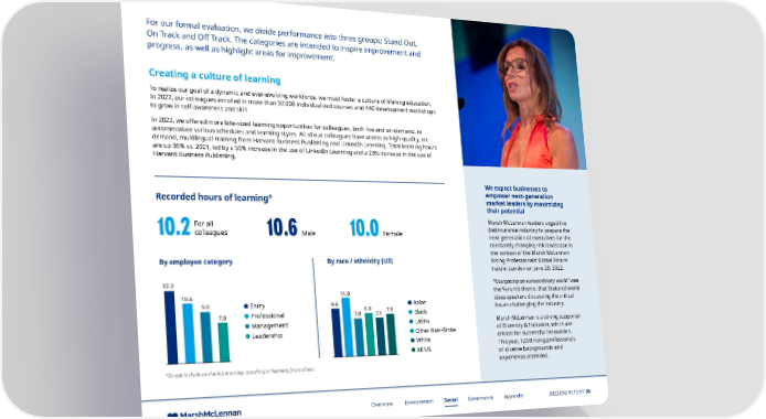 For our formal evaluation, we divide performance into three groups: Stand Out, On Track and O昀昀 Track. The categories are intended to inspire improvement and progress, as well as highlight areas for improvement. Creating a culture of learning To realize our goal of a dynamic and ever-evolving workforce, we must foster a culture of lifelong education. In 2022, our colleagues enrolled in more than 37.000 individualized courses and 440 development workshops to grow in self-awareness and skill. In 2022, we offered more bite-sized learning opportunities for colleagues, both live and on-demand, to accommodate various schedules and learning styles. All of our colleagues have access to high-quality, on- demand, multilingual training from Harvard Business Publishing and LinkedIn Learning. Total learning hours are up 36% vs. 2021, led by a 50% increase in the use of LinkedIn Learning and a 23% increase in the use of Harvard Business Publishing. We expect businesses to Recorded hours of learning* empower next-generation market leaders by maximizing their potential For all Marsh McLennan leaders urged the 10.2 colleagues 10.6 Male 10.0 Female (re)insurance industry to prepare the next generation of executives for the constantly changing risk landscape in the context of the Marsh McLennan By employee category By race / ethnicity (US) Rising Professionals’ Global Forum held in London on June 29, 2022. 12.8 “Navigating an extraordinary world” was 10.6 11.0 the Forum’s theme, that featured world 9.0 Entry 9.0 Asian class speakers discussing the critical Professional 7.0 8.0 7.1 7.8 Black issues challenging the industry. 7.0 Management Latinx Marsh McLennan is a strong supporter Leadership Other Non-White of Diversity & Inclusion, which are White critical for successful innovation. All US This year, 1,000 rising professionals of diverse backgrounds and * Do not include on-the-job learning, coaching or learning from others. experience attended. Overview Environment Social Governance Appendix 2022 ESG REPORT 36