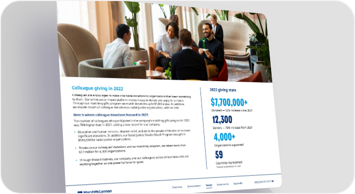 Colleague giving in 2022 2022 giving stats Colleagues are encouraged to make charitable donations to organizations that mean something to them. Our online social impact platform makes it easy to donate and apply for a match. Through our matching gifts program we match donations up to $1,000 a year. In addition, $7,700,000+ we double-match all colleague donations to social justice organizations, with no limit. Donated — 52% increase since 2021 Here is where colleague donations focused in 2022: The number of colleagues who participated in the company’s matching gifts program in 2022 12,300 was 76% higher than in 2021, setting a new record for our company. • Education and human services, disaster relief, and aid to the people of Ukraine all received Donors — 76% increase from 2021 significant donations. In addition, our Social Justice Double Match Program brought in $580,000 for racial justice organizations. 4,000+ • Thanks to our colleagues’ donations and our matching program, we raised more than Organizations supported $7.7 million for 4,300 organizations. • Through these initiatives, our company and our colleagues across all business units are 59 working together as one powerful force for good. Countries represented *Data as of December 31, 2022 Overview Environment Social Governance Appendix 2022 ESG REPORT 38
