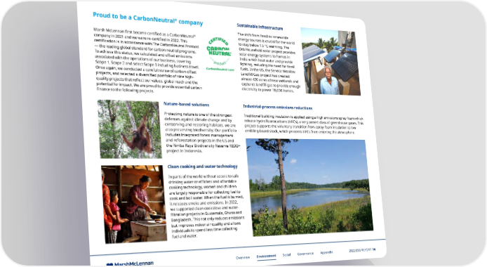 ® Sustainable infrastructure Proud to be a CarbonNeutral company The shift from fossil to renewable Marsh McLennan first became certified as a CarbonNeutral® energy sources is crucial for the world company in 2021 and we were re-certified in 2022. This to stay below 1.5 °C warming. The certification is in accordance with The CarbonNeutral Protocol Orb Household solar project provides — the leading global standard for carbon neutral programs. solar energy systems to homes in To achieve this status, we calculated and offset emissions India which heat water and provide associated with the operations of our business, covering lighting, reducing the need for fossil Scope 1, Scope 2 and select Scope 3 including business travel. fuels. In the US, the Seneca Meadow Once again, we conducted a careful review of carbon offset Landfill Gas project has created projects, and selected a diversified portfolio of nine high- almost 420 acres of new wetlands and quality projects that reflect our values, global reach and the captures landfill gas to provide enough potential for impact. We are proud to provide essential carbon electricity to power 18,000 homes. finance to the following projects. Nature-based solutions Industrial-process emissions reductions Protecting nature is one of the strongest Traditional building insulation is applied using a high emissions spray foam which defenses against climate change and by release hydrofluorocarbons (HFCs), a very potent class of greenhouse gases. This conserving and restoring habitats, we are project supports the voluntary transition from spray-foam insulation to low- also preserving biodiversity. Our portfolio emitting board stock, which prevents HFCs from entering the atmosphere. includes integrated forest management and reforestation projects in the US and the Rimba Raya Biodiversity Reserve REDD+ project in Indonesia. Clean cooking and water technology In parts of the world without access to safe drinking water or efficient and affordable cooking technology, women and children are largely responsible for collecting fuel to cook and boil water. When the fuel is burned, it releases smoke and emissions. In 2022, we supported clean cookstove and water- filtration projects in Guatemala, Ghana and Bangladesh. This not only reduces emissions but improves indoor air quality and allows individuals to spend less time collecting fuel and water. Overview Environment Social Governance Appendix 2022 ESG REPORT 14