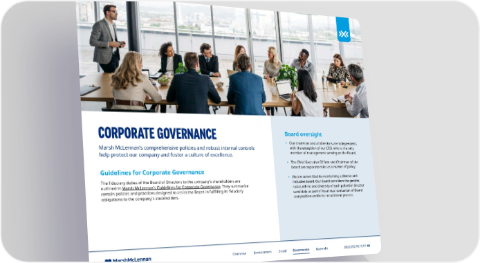 Corporate Governance Board oversight • Our chairman and all directors are independent, Marsh McLennan’s comprehensive policies and robust internal controls with the exception of our CEO, who is the only help protect our company and foster a culture of excellence. member of management serving on the Board. • The Chief Executive Officer and Chairman of the Guidelines for Corporate Governance Board are separate roles as a matter of policy. The fiduciary duties of the Board of Directors to the company’s shareholders are • We are committed to maintaining a diverse and outlined in Marsh McLennan’s Guidelines for Corporate Governance. They summarize inclusive board. Our Board considers the gender, certain policies and practices designed to assist the Board in fulfilling its fiduciary racial, ethnic and diversity of each potential director obligations to the company’s stockholders. candidate as part of its annual evaluation of Board composition and in its recruitment process. Overview Environment Social Governance Appendix 2022 ESG REPORT 46