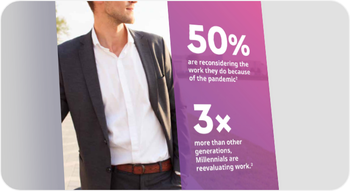 50% are reconsidering the work they do because of the pandemic2 3 × more than other generations, Millennials are reevaluating work.2 2023 Benefits Trends: The evolving workplace 11