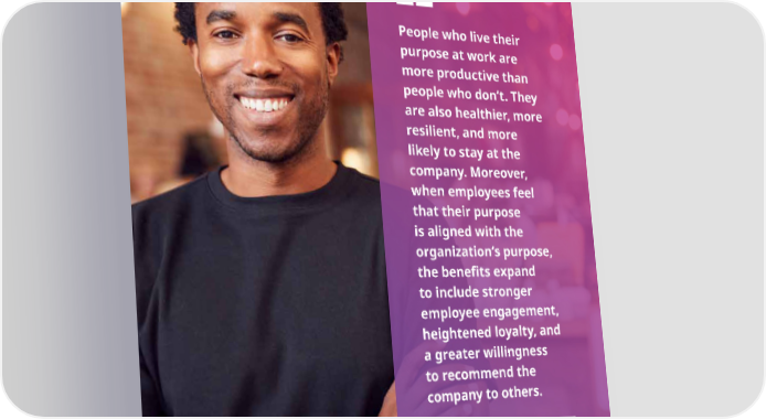 People who live their purpose at work are more productive than people who don’t. They are also healthier, more resilient, and more likely to stay at the company. Moreover, when employees feel that their purpose is aligned with the organization’s purpose, the bene昀椀ts expand to include stronger employee engagement, heightened loyalty, and a greater willingness to recommend the company to others. 2 –McKinsey 2023 Benefits Trends: The evolving workplace 13