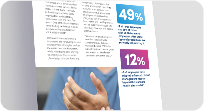 We anticipate frequency and severity of medical stop loss claims to tick up as the 2022 year 1 progresses and extends into 2023. This is an outcome of deferral on specialty pharmacies, site challenges and a direct result of of care, and support from drug macro economic factors. These manufacturers to lower out- impacts have made their way of-pocket costs. It also means to health care, spiking costs employers are demanding 49% to providers and expecting integrated care management to increase over the next 昀椀ve from PBM’s and health plans as of all large employers years. One of the top in昀氀uences well as supplemental specialty contributing to the rise in costs pharmacy coverage and captive and 58% of those are worsening availability of arrangements. with 20,000 or more 6 clinical labor sta昀昀. The use of targeted programs employees o昀昀er these With cost increases looming, aimed at speci昀椀c health types of programs or are employers are refocusing on cost conditions (e.g., diabetes, seriously considering it. management strategies to slow musculoskeletal, COPD) has increases over the long term, gained traction in recent years while minimizing cost shifting as a way to achieve better 4,7 to employees. This includes outcomes and lower costs. plan design changes focusing 12% of all employers have adopted enhanced clinical management models beyond the standard 7 health plan model. 2023 Benefits Trends: The evolving workplace 60