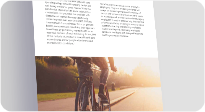 Prioritizing well-being in policies and bene昀椀ts is critical to developing the workplace resilience employers are seeking. By 2040, it’s expected that 60% of health care Reducing stigma remains a central priority for spending will go toward improving health and employers. Programs are being designed with well-being and it’s for good reason. While the an eye on increasing employees’ knowledge of pandemic’s impact isn’t as acute today, it has mental and behavioral health disorders to create created and compounded the problem with an accepting work environment and encouraging diagnoses of mental illnesses signi昀椀cantly employees in need to seek out help. Bene昀椀ts that increasing year over year since 2020. Shifting prioritize well-being are going to remain a critical the emphasis from a singular focus on physical aspect of attracting and retaining employees health, companies are rede昀椀ning their approach in 2022 and beyond. Addressing employees’ to wellness by prioritizing mental health as an emotional health and well-being will be core to essential element of total well-being. In fact, 90% building workplace resilience. of the nation’s $4.1 trillion in annual health care expenditures are for people with chronic and 1 mental health conditions. 2023 Benefits Trends: The evolving workplace 35