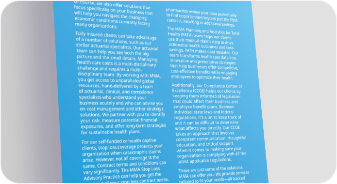 Navigate economic 昀氀uctuation Of course, we also o昀昀er solutions that pharmacists review your data periodically focus speci昀椀cally on your business that to 昀椀nd opportunities beyond just the PBM will help you navigate the changing contract, resulting in additional savings. economic conditions currently facing The MMA Planning and Analytics for Total many organizations. Health (PATH) team helps our clients Fully insured clients can take advantage use their medical claims data to drive of a number of solutions, such as our actionable health outcomes and cost- stellar actuarial specialists. Our actuarial savings. PATH makes data valuable. Our team can help you see both the big team transforms health care data into picture and the small details. Managing innovative and prescriptive strategies health care costs is a multi-disciplinary that help businesses o昀昀er competitive, challenge and requires a multi- cost-e昀昀ective bene昀椀ts while engaging disciplinary team. By working with MMA, employees to optimize their health. you get access to unparalleled global Additionally, our Compliance Center of resources, hand-delivered by a team Excellence (CCOE) helps our clients by of actuarial, clinical, and compliance keeping them informed of legislation specialists who understand your business acutely and who can advise you that could a昀昀ect their business and on cost management and other strategic employee bene昀椀t plans. Between solutions. We partner with you to identify individual state laws and federal regulations, it’s a lot to keep track of your risk, measure potential 昀椀nancial and it can be di昀케cult to determine exposures, and o昀昀er long-term strategies for sustainable health plans. what a昀昀ects you directly. Our CCOE takes an approach that involves For our self-funded or health captive consistent communication, thoughtful clients, stop loss coverage protects your education, and critical support organization when catastrophic claims when it comes to making sure your arise. However, not all coverage is the organization is complying with all the same. Contract terms and conditions can latest applicable regulations. vary signi昀椀cantly. The MMA Stop Loss Advisory Practice can help you get the These are just some of the solutions most out of your stop loss contract terms. MMA can o昀昀er you. We provide services tailored to 昀椀t your needs—all backed SM MMA Rx Solutions delivers signi昀椀cant by a broad scope of global resources. savings to self-insured health plans by Reach out today to get in touch with an focusing on contract language, clinical MMA consultant and start building your and formulary management strategies, strategy for 2023 and beyond. and employee purchasing trends. Our dedicated team of actuaries and 2023 Benefits Trends: The evolving workplace 75