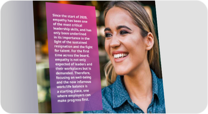 Since the start of 2020, empathy has been one of the most critical leadership skills, and has only been underlined in its importance in the light of the sustained resignation and the 昀椀ght for talent. For the 昀椀rst time across the board, empathy is not only expected of leaders and their workplaces but is demanded. Therefore, focusing on well-being and the now infamous work/life balance is a starting place, one where employers can make progress 昀椀rst. 2023 Benefits Trends: The evolving workplace 31