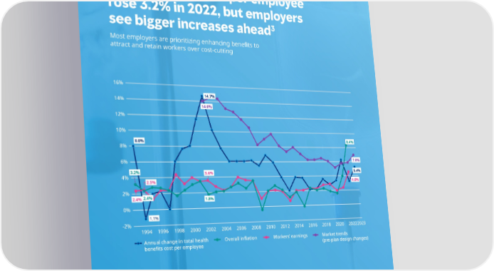 Health bene昀椀t cost per employee rose 3.2% in 2022, but employers 3 see bigger increases ahead Most employers are prioritizing enhancing bene昀椀ts to attract and retain workers over cost-cutting 16% 14% 14.7% 14.0% 12% 10% 8.0% 8.4% 8% 6% 7.0% 3.2% 3.6% 5.4% 4% 2.5% 4.6% 2% 2.4% 2.4% 1.8% 0% 1.1% - -2% 1994 1996 1998 2000 2002 2004 2006 2008 2010 2012 2014 2016 2018 2020 20222023 Annual change in total health Overall inflation Workers’ earnings Market trends benefits cost per employee (pre-plan design changes) 2023 Benefits Trends: The evolving workplace 58