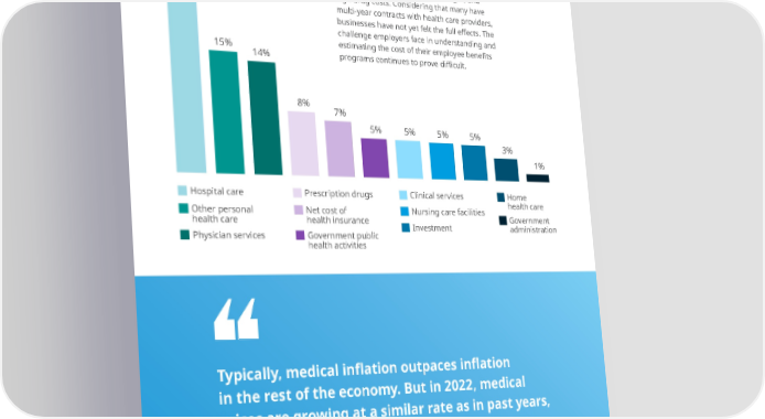 31% There are a variety of reasons for the rising costs, all of which are coming together in a perfect storm of in昀氀ation, deferred care, supply- chain constraints, retention challenges, and high drug costs. Considering that many have multi-year contracts with health care providers, businesses have not yet felt the full e昀昀ects. The challenge employers face in understanding and 15% estimating the cost of their employee bene昀椀ts 14% programs continues to prove di昀케cult. 8% 7% 5% 5% 5% 5% 3% 1% Hospital care Prescription drugs Clinical services Home Other personal Net cost of Nursing care facilities health care health care health insurance Investment Government Physician services Government public administration health activities Typically, medical in昀氀ation outpaces in昀氀ation in the rest of the economy. But in 2022, medical prices are growing at a similar rate as in past years, while prices in some other parts of the economy are growing much more rapidly than in the past. –Peterson-KFF, Health Systems Tracker5 2023 Benefits Trends: The evolving workplace 59