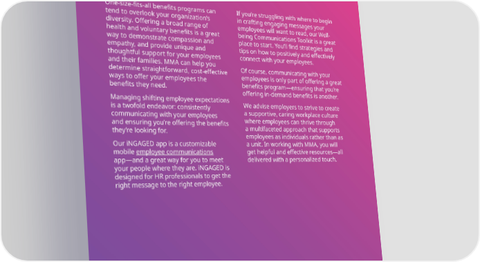 Manage shifting expectations One-size-昀椀ts-all bene昀椀ts programs can If you’re struggling with where to begin tend to overlook your organization’s in crafting engaging messages your diversity. O昀昀ering a broad range of employees will want to read, our Well- health and voluntary bene昀椀ts is a great being Communications Toolkit is a great way to demonstrate compassion and place to start. You’ll 昀椀nd strategies and empathy, and provide unique and tips on how to positively and e昀昀ectively thoughtful support for your employees connect with your employees. and their families. MMA can help you Of course, communicating with your determine straightforward, cost-e昀昀ective employees is only part of o昀昀ering a great ways to o昀昀er your employees the bene昀椀ts program—ensuring that you’re bene昀椀ts they need. o昀昀ering in-demand bene昀椀ts is another. Managing shifting employee expectations We advise employers to strive to create is a twofold endeavor: consistently a supportive, caring workplace culture communicating with your employees where employees can thrive through and ensuring you’re o昀昀ering the bene昀椀ts a multifaceted approach that supports they’re looking for. employees as individuals rather than as Our iNGAGED app is a customizable a unit. In working with MMA, you will mobile employee communications get helpful and e昀昀ective resources—all app—and a great way for you to meet delivered with a personalized touch. your people where they are. iNGAGED is designed for HR professionals to get the right message to the right employee. 2023 Benefits Trends: The evolving workplace 33