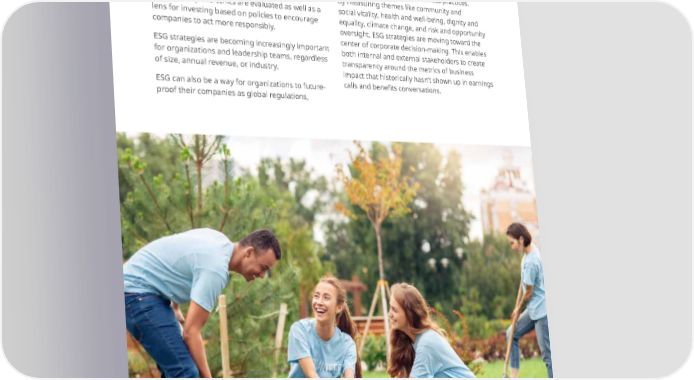 What is ESG? The initialism ESG stands for the environmental, consumers, and employees demand more social, and governance impacts of an organization. sustainable and equitable business practices. These three key dimensions are how corporate By measuring themes like community and sustainability and ethics are evaluated as well as a social vitality, health and well-being, dignity and lens for investing based on policies to encourage equality, climate change, and risk and opportunity companies to act more responsibly. oversight, ESG strategies are moving toward the ESG strategies are becoming increasingly important center of corporate decision-making. This enables for organizations and leadership teams, regardless both internal and external stakeholders to create of size, annual revenue, or industry. transparency around the metrics of business impact that historically hasn’t shown up in earnings ESG can also be a way for organizations to future- calls and bene昀椀ts conversations. proof their companies as global regulations, 2023 Benefits Trends: The evolving workplace 4