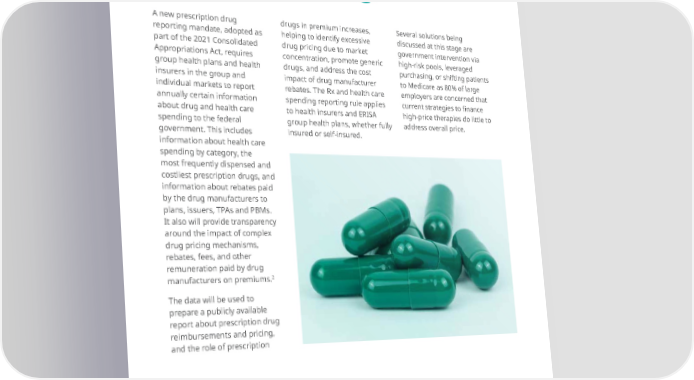 Secondarily, the focus is on both the rising costs and mandated Rx reporting. A new prescription drug drugs in premium increases, Several solutions being reporting mandate, adopted as helping to identify excessive discussed at this stage are part of the 2021 Consolidated drug pricing due to market government intervention via Appropriations Act, requires concentration, promote generic high-risk pools, leveraged group health plans and health drugs, and address the cost purchasing, or shifting patients insurers in the group and impact of drug manufacturer to Medicare as 80% of large individual markets to report rebates. The Rx and health care employers are concerned that annually certain information spending reporting rule applies current strategies to 昀椀nance about drug and health care to health insurers and ERISA high-price therapies do little to spending to the federal group health plans, whether fully address overall price. government. This includes insured or self-insured. information about health care spending by category, the most frequently dispensed and costliest prescription drugs, and information about rebates paid by the drug manufacturers to plans, issuers, TPAs and PBMs. It also will provide transparency around the impact of complex drug pricing mechanisms, rebates, fees, and other remuneration paid by drug 2 manufacturers on premiums. The data will be used to prepare a publicly available report about prescription drug reimbursements and pricing, and the role of prescription 2023 Benefits Trends: The evolving workplace 80