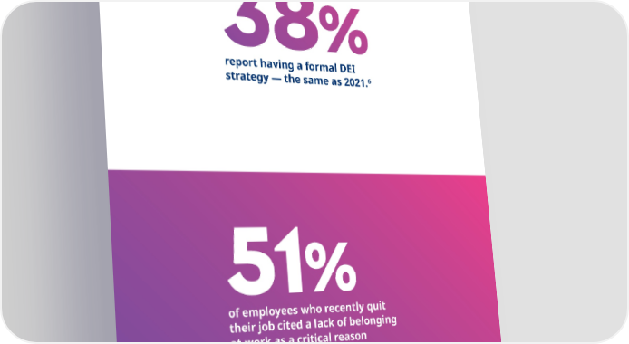 38% report having a formal DEI 6 strategy — the same as 2021. 51% of employees who recently quit their job cited a lack of belonging at work as a critical reason for leaving. Employees from underrepresented identities were 9 even more likely to cite this reason. 2023 Benefits Trends: The evolving workplace 22