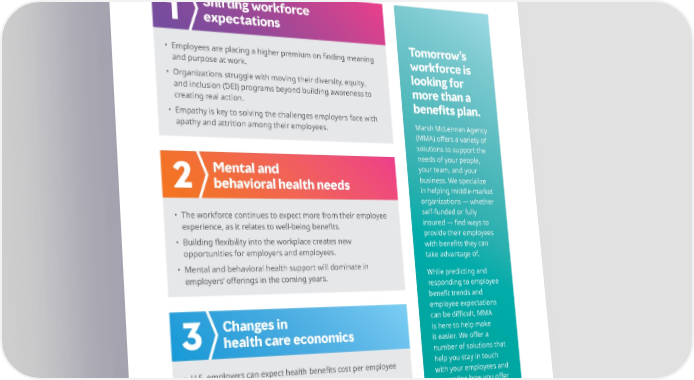 The employee health & bene昀椀ts trends of 2023 Shifting workforce 1 expectations Tomorrow’s • Employees are placing a higher premium on 昀椀nding meaning and purpose at work. workforce is • Organizations struggle with moving their diversity, equity, looking for and inclusion (DEI) programs beyond building awareness to more than a creating real action. bene昀椀ts plan. • Empathy is key to solving the challenges employers face with Marsh McLennan Agency apathy and attrition among their employees. (MMA) o昀昀ers a variety of solutions to support the needs of your people, Mental and your team, and your business. We specialize 2 behavioral health needs in helping middle-market organizations — whether • The workforce continues to expect more from their employee self-funded or fully insured — 昀椀nd ways to experience, as it relates to well-being bene昀椀ts. provide their employees • Building 昀氀exibility into the workplace creates new opportunities for employers and employees. with bene昀椀ts they can take advantage of. • Mental and behavioral health support will dominate in While predicting and employers’ o昀昀erings in the coming years. responding to employee bene昀椀t trends and employee expectations Changes in can be di昀케cult, MMA is here to help make 3 health care economics it easier. We o昀昀er a number of solutions that • U.S. employers can expect health bene昀椀ts cost per employee help you stay in touch to increase to 7%. with your employees and • High-cost prescription drugs are a source of frustration, streamline how you o昀昀er especially with cell and gene therapies that cost millions. the bene昀椀ts they need. • High-cost claimants, utilization increases, and employment trends will keep health care costs higher overall. 2023 Benefits Trends: The evolving workplace 2