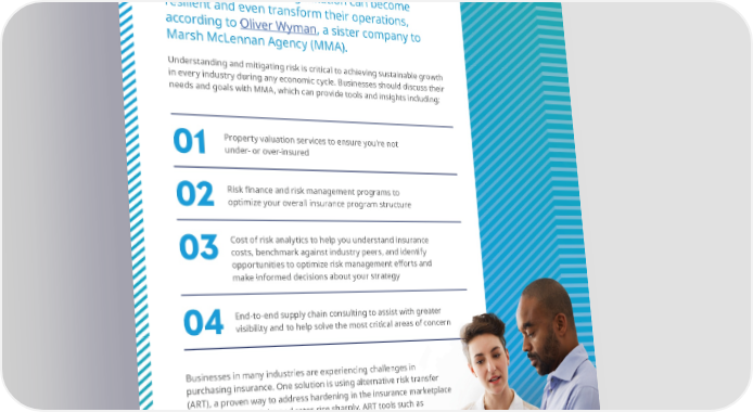 Recommended actions and how we can help Businesses experiencing in昀氀ation can become resilient and even transform their operations, according to Oliver Wyman, a sister company to Marsh McLennan Agency (MMA). Understanding and mitigating risk is critical to achieving sustainable growth in every industry during any economic cycle. Businesses should discuss their needs and goals with MMA, which can provide tools and insights including: Property valuation services to ensure you’re not 01 under- or over-insured Risk 昀椀nance and risk management programs to 02 optimize your overall insurance program structure Cost of risk analytics to help you understand insurance 03 costs, benchmark against industry peers, and identify opportunities to optimize risk management e昀昀orts and make informed decisions about your strategy End-to-end supply chain consulting to assist with greater 04 visibility and to help solve the most critical areas of concern Businesses in many industries are experiencing challenges in purchasing insurance. One solution is using alternative risk transfer (ART), a proven way to address hardening in the insurance marketplace when capacity shrinks and rates rise sharply. ART tools such as captives, structured program design, and parametric insurance can provide long-term relief with access to needed coverage. Business Insurance Trends 44
