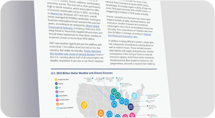 What these trends mean for businesses Catastrophic risk comes in many forms. The even excessive snowmelt or ice jams on rivers can next pandemic or epidemic is tough to predict. cause severe 昀氀ooding. In the U.S., many would However, natural events will likely continue to cause assume coastal areas account for most of the devastation and disruption around the world, in national 昀氀ood insurance program (NFIP) claims. the form of storms, 昀氀oods, wild昀椀res, earthquakes, Surprisingly, it’s actually regions outside of high-risk and other events. The loss toll is often particularly areas 昀椀ling approximately 40% of NFIP claims—a high in North America, which accounted for 98% staggering $2.4 billion in NFIP losses annually. of insured catastrophe losses in 2022, according to Munich Re. Between 2017 and 2021, overall Human-caused losses that have had catastrophic impacts include oil spills, chemical releases, and losses averaged $270 billion worldwide. Contingent explosions. Another frequent and sometimes business interruption losses soared in the past two years, according to an analysis by Allianz Global catastrophic risk is 昀椀re in nonresidential structures. Corporate & Specialty, including a February 2021 Annually, 昀椀res cause dozens of fatalities and more than $2 billion in damage, according to National deep freeze in Texas that crippled infrastructure and Fire Protection Association data. forced many businesses to shut down, leading to economic losses of more than $150 billion. In addition to being di昀케cult to predict, catastrophic risk compounds uncertainty by causing direct as 2021 was another signi昀椀cant year for wild昀椀res with well as indirect losses. These include business more than 7.34 million acres burned across the country. But make no mistake, 昀氀oods represent interruptions and supply chain pressures. Another the number one cause of natural disaster losses in consequence of the string of losses is reduced insurance capacity. Amid these trends, businesses the U.S. causing about half of all catastrophic risk should examine their property exposures, risk deaths. Anywhere it can rain, it can 昀氀ood. However, preparedness, and seek to improve their resiliency. U.S. 2022 Billion-Dollar Weather and Climate Disasters Central Severe North Central North Central North Central Weather Severe Weather Hail Storms Hail Storms June 7–8 May 11–12 May 9 May 19 North Central and Eastern Severe Weather July 22–24 Central and Eastern Winter Storm and Cold Wave December 21–26 Central Derecho June 13 Kentucky and Missouri Flooding July 26–28 Western/Central Southeastern Drought and Tornado Outbreak Heat Wave 2022 April 4–6 Western Wildfires Hurricane Nicole Spring–Fall November 10–11 Southern and Central Hurricane Ian Severe Weather September 28–30 May 1–3 Southern Severe Southern Texas Hail Storms Weather Tornado Outbreak February 21–22 April 11–13 March 30 Hurricane Fiona September 17–18 This map denotes the approximate location for each of the 18 separate billion-dollar weather and climate disasters that impacted the United States in 2022. Source: NOAA National Centers for Environmental Information (NCEI) U.S. Billion-Dollar Weather and Climate Disasters (2023). https://www.ncei.noaa.gov/access/billions/, DOI: 10.25921/stkw-7w73 Business Business Business InsurInsurInsurance ance ance TTTrrrendsendsends 777