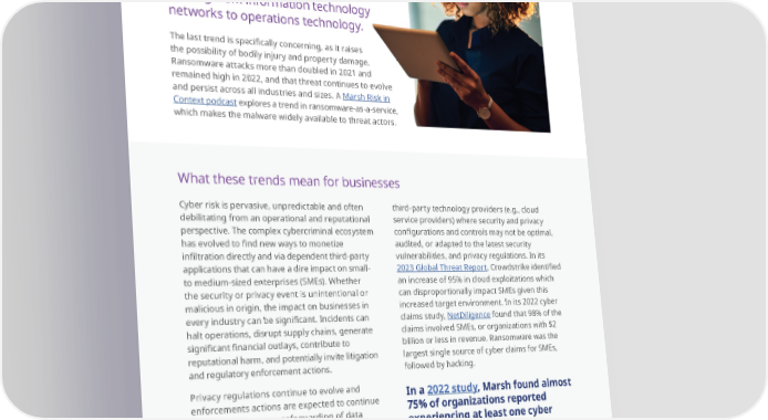 Trends in this area include new tactics by cybercriminals to extort payments, novel social engineering attempts to obtain access to sensitive data, and attacks shifting from information technology networks to operations technology. The last trend is speci昀椀cally concerning, as it raises the possibility of bodily injury and property damage. Ransomware attacks more than doubled in 2021 and remained high in 2022, and that threat continues to evolve and persist across all industries and sizes. A Marsh Risk in Context podcast explores a trend in ransomware-as-a-service, which makes the malware widely available to threat actors. What these trends mean for businesses Cyber risk is pervasive, unpredictable and often third-party technology providers (e.g., cloud debilitating from an operational and reputational service providers) where security and privacy perspective. The complex cybercriminal ecosystem con昀椀gurations and controls may not be optimal, has evolved to 昀椀nd new ways to monetize audited, or adapted to the latest security in昀椀ltration directly and via dependent third-party vulnerabilities, and privacy regulations. In its applications that can have a dire impact on small- 2023 Global Threat Report, Crowdstrike identi昀椀ed to medium-sized enterprises (SMEs). Whether an increase of 95% in cloud exploitations which the security or privacy event is unintentional or can disproportionally impact SMEs given this malicious in origin, the impact on businesses in increased target environment. In its 2022 cyber every industry can be signi昀椀cant. Incidents can claims study, NetDiligence found that 98% of the halt operations, disrupt supply chains, generate claims involved SMEs, or organizations with $2 signi昀椀cant 昀椀nancial outlays, contribute to billion or less in revenue. Ransomware was the reputational harm, and potentially invite litigation largest single source of cyber claims for SMEs, and regulatory enforcement actions. followed by hacking. Privacy regulations continue to evolve and In a 2022 study, Marsh found almost enforcements actions are expected to continue 75% of organizations reported to increase to ensure safeguarding of data experiencing at least one cyber including usage, collection, and retention of incident in the past 12 months. third-party information. SMEs tend to be attractive targets by threat Notably, only 3% rated their organization’s cyber actors, because most SMEs rely on data and hygiene as “excellent.” Almost three in four networks but have fewer cybersecurity resources respondents deemed their organization’s cyber than larger organizations. They often rely on hygiene as “satisfactory” or “needs improvement.” Business Business Business InsurInsurInsurance ance ance TTTrrrendsendsends 171717