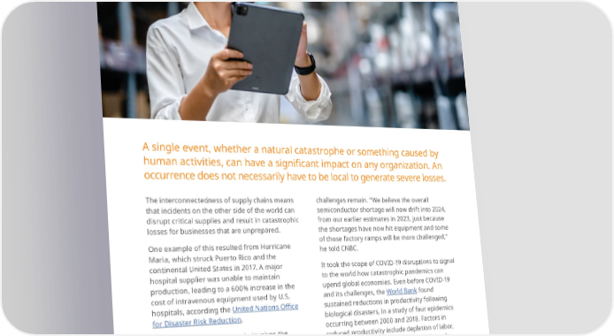 A single event, whether a natural catastrophe or something caused by human activities, can have a signi昀椀cant impact on any organization. An occurrence does not necessarily have to be local to generate severe losses. The interconnectedness of supply chains means challenges remain. “We believe the overall that incidents on the other side of the world can semiconductor shortage will now drift into 2024, disrupt critical supplies and result in catastrophic from our earlier estimates in 2023, just because losses for businesses that are unprepared. the shortages have now hit equipment and some of those factory ramps will be more challenged,” One example of this resulted from Hurricane he told CNBC. Maria, which struck Puerto Rico and the continental United States in 2017. A major It took the scope of COVID-19 disruptions to signal hospital supplier was unable to maintain to the world how catastrophic pandemics can production, leading to a 600% increase in the upend global economies. Even before COVID-19 cost of intravenous equipment used by U.S. and its challenges, the World Bank found hospitals, according the United Nations O昀케ce sustained reductions in productivity following for Disaster Risk Reduction. biological disasters, in a study of four epidemics Another more recent example involves the occurring between 2000 and 2018. Factors in reduced productivity include depletion of labor, shortage of chips used to create a variety of weakened capital resources, disrupted supply electronic devices, largely as a result of the chains, lower business investment, and reduced COVID-19 pandemic. From video game consoles consumer demand. and smartphones to cars and LED lights, a wide swath of industries were—and still are—a昀昀ected Catastrophic risk can by this shortage. CEO of Intel Pat Gelsinger threaten the survival of noted that while things have improved, di昀昀erent organizations of all sizes. Business InsurBusiness Insurance Tance Trrendsends 66