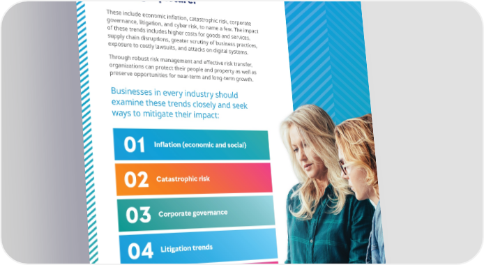 From in昀氀ation to cyber risk, doing business in today’s market requires you to understand the individual trends that make up the bigger picture. These include economic in昀氀ation, catastrophic risk, corporate governance, litigation, and cyber risk, to name a few. The impact of these trends includes higher costs for goods and services, supply chain disruptions, greater scrutiny of business practices, exposure to costly lawsuits, and attacks on digital systems. Through robust risk management and e昀昀ective risk transfer, organizations can protect their people and property as well as preserve opportunities for near-term and long-term growth. Businesses in every industry should examine these trends closely and seek ways to mitigate their impact: 01 In昀氀ation (economic and social) 02 Catastrophic risk 03 Corporate governance 04 Litigation trends 05 Cyber risk Business Insurance Trends 11