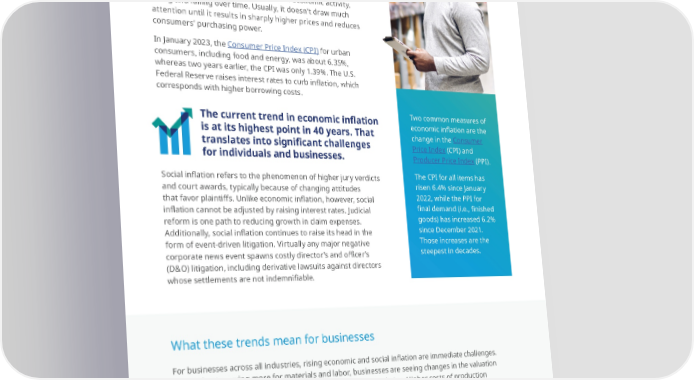 Supply chain disruptions are still above historical levels and companies are also still recovering from COVID-related challenges. In昀氀ation occurs in the normal course of economic activity, rising and falling over time. Usually, it doesn’t draw much attention until it results in sharply higher prices and reduces consumers’ purchasing power. In January 2023, the Consumer Price Index (CPI) for urban consumers, including food and energy, was about 6.35%, whereas two years earlier, the CPI was only 1.39%. The U.S. Federal Reserve raises interest rates to curb in昀氀ation, which corresponds with higher borrowing costs. Two common measures of The current trend in economic in昀氀ation is at its highest point in 40 years. That economic in昀氀ation are the change in the Consumer translates into signi昀椀cant challenges Price Index (CPI) and for individuals and businesses. Producer Price Index (PPI). The CPI for all items has Social in昀氀ation refers to the phenomenon of higher jury verdicts risen 6.4% since January and court awards, typically because of changing attitudes 2022, while the PPI for that favor plainti昀昀s. Unlike economic in昀氀ation, however, social 昀椀nal demand (i.e., 昀椀nished in昀氀ation cannot be adjusted by raising interest rates. Judicial goods) has increased 6.2% reform is one path to reducing growth in claim expenses. since December 2021. Additionally, social in昀氀ation continues to raise its head in the Those increases are the form of event-driven litigation. Virtually any major negative steepest in decades. corporate news event spawns costly director’s and o昀케cer’s (D&O) litigation, including derivative lawsuits against directors whose settlements are not indemni昀椀able. What these trends mean for businesses For businesses across all industries, rising economic and social in昀氀ation are immediate challenges. In addition to paying more for materials and labor, businesses are seeing changes in the valuation of their insured property and emerging risks in their supply chains. Higher costs of production usually result in increased prices for purchasers, which can reduce pro昀椀tability and force businesses to defer growth initiatives. Higher interest rates also raise the cost of capital, which can impact businesses’ debt burdens and access to credit. Meanwhile, social in昀氀ation is causing steep growth of claims expenses in property, liability, health care, and workers’ compensation insurance programs. Business InsurBusiness Insurance Tance Trrendsends 33