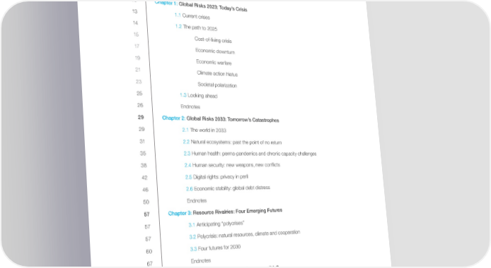 January 2023 Global Risks Report 2023 Contents 4 Preface 5 Overview of Methodology 6 Executive Summary 13 Chapter 1: Global Risks 2023: Today’s Crisis 13 1.1 Current crises 14 1.2 The path to 2025 15 Cost-of-living crisis 17 Economic downturn 19 Economic warfare 21 Climate action hiatus 23 Societal polarization 25 1.3 Looking ahead 26 Endnotes 29 Chapter 2: Global Risks 2033: Tomorrow’s Catastrophes 29 2.1 The world in 2033 31 2.2 Natural ecosystems: past the point of no return 35 2.3 Human health: perma-pandemics and chronic capacity challenges 38 2.4 Human security: new weapons, new con昀氀icts 42 2.5 Digital rights: privacy in peril 46 2.6 Economic stability: global debt distress 50 Endnotes 57 Chapter 3: Resource Rivalries: Four Emerging Futures 57 3.1 Anticipating “polycrises” 57 3.2 Polycrisis: natural resources, climate and cooperation 60 3.3 Four futures for 2030 67 Endnotes 69 Chapter 4: Conclusion: is preparedness possible? 73 Endnotes 74 Appendix A – Technical Notes: Global Risks Perception Survey 2022-2023 79 Appendix B – Executive Opinion Survey: National Risk Perceptions 96 Acknowledgements © 2023 World Economic Forum. All rights reserved. No part of this publication may be reproduced or transmitted in any form or by any means, including photocopying and recording, or by any information storage and retrieval system. Global Risks Report 2023 3