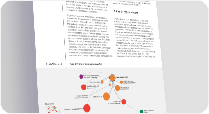 of nuclear weaponry remain high, the unconstrained largest number of annual ballistic missiles launches pursuit of lower-yield weaponry and stronger last year, and there is escalating rhetoric in the 71 defensive military technologies could undermine the context of the war in Ukraine. The possibility of perceived security provided by nuclear weapons, nuclear-sharing arrangements or even potential putting in jeopardy a delicate strategic balance. acquisition in limited circumstances has been raised Emerging technologies heighten the actual or in some non-nuclear states, such as Japan and 72 perceived vulnerability of countries to attack, the South Korea. Negotiations on the revival of 67 including nuclear-armed ones. Advanced sensing the Joint Comprehensive Plan of Action (JCPOA) 73 technologies, particularly once enabled by quantum have also stalled. Although both the United computing, could theoretically expose second-strike States of America and Russia have continued to capabilities (mobile nuclear weapons) to real-time adhere to the New START Treaty, and disarmament 68 targeting and elimination. The potential for lower- technically continues, the usable military stockpiles yield, more targeted nuclear weaponry has already of both countries - accounting for 90% of all nuclear brought into question the viability of the current weapons - remained stable in 2021.74 threshold of activation for the “nuclear umbrella” of the United States of America. An escalating arms race may cause countries to roll back the no-昀椀rst- A rise in rogue actors use principle to enhance deterrence. Together, these new technologies are escalating Proliferation of more destructive and new-tech rhetoric and the pressure on existing governance military weaponry may enable newer forms of mechanisms. This could lead to an increase in asymmetric warfare, allowing smaller powers and the global inventory of nuclear warheads for the individuals to have a greater impact at a national and 昀椀rst time since the Cold War,69 raising the risk of global level. Financial, information and intelligence accidental, miscalculated or deliberate clashes, thresholds are lower in many dual-use technologies. with devastating results. Nuclear-armed countries For example, advances in biotechnologies could continue to modernize arsenals and develop new enable the creation of pathogens by small groups or types of delivery systems; late last year, the United even individuals.75 Low-cost drones utilizing swarm States of America unveiled its 昀椀rst new nuclear- intelligence can be used to attack high-value units, 76 capable strategic bomber in more than three including bases and fuel tanks. The most recent decades. The Treaty on the Prohibition of Nuclear available data suggests a consolidation of arms Weapons, which entered into force in early 2021, exports, with North America and Europe accounting continues to be opposed by all nine declared for 87% of all arms exports from 2017-2021, 70 nuclear-armed states. North Korea conducted the alongside an accompanying decline from China and FIGURE 2.8 Key drivers of interstate conflict Widespread cybercrime and cyber insecurity Interstate conflict Terrorist attacks Ineffectiveness of multilateral institutions Misinformation and disinformation Geoeconomic confrontation Use of weapons State collapse of mass destruction Reference Large-scale involuntary migration Erosion of social cohesion Natural resource crises Nodes EdgesEdges Risk influence Relative influence High High Medium Medium Low Low Risk categories Economic Environmental Geopolitical Societal Technological Source World Economic Forum, Global Risks Perception Survey 2022-2023. Global Risks Report 2023 41