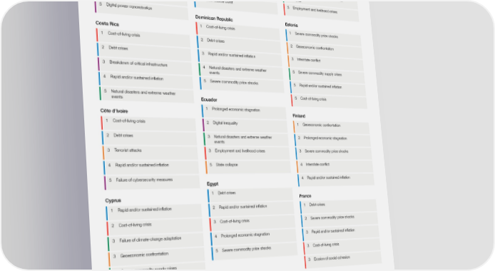 TABLE B.2 Top five risks identified by the Executive Opinion Survey (EOS) Congo (Democratic Republic of) Denmark El Salvador 1 Digital inequality 1 Breakdown of critical infrastructure 1 Debt crises 2 State collapse 2 Rapid and/or sustained inflation 2 State collapse 3 Debt crises 3 Severe commodity price shocks 3 Cost-of-living crisis 5 Interstate conflict 4 Geoeconomic confrontation 4 Natural disasters and extreme weather events 5 Cost-of-living crisis 5 Asset bubble burst 5 Employment and livelihood crises 5 Digital power concentration Dominican Republic Estonia 1 Cost-of-living crisis 1 Severe commodity price shocks Costa Rica 1 Cost-of-living crisis 2 Debt crises 2 Geoeconomic confrontation 2 Debt crises 3 Rapid and/or sustained inflation 3 Interstate conflict 3 Breakdown of critical infrastructure 4 Natural disasters and extreme weather 5 Severe commodity supply crises events 4 Rapid and/or sustained inflation 5 Severe commodity price shocks 5 Rapid and/or sustained inflation 5 Natural disasters and extreme weather 5 Cost-of-living crisis events Ecuador 1 Prolonged economic stagnation Côte d'Ivoire Finland 1 Cost-of-living crisis 2 Digital inequality 1 Geoeconomic confrontation 2 Debt crises 3 Natural disasters and extreme weather 2 Prolonged economic stagnation events 3 Terrorist attacks 3 Employment and livelihood crises 3 Severe commodity price shocks 4 Rapid and/or sustained inflation 5 State collapse 4 Interstate conflict 5 Failure of cybersecurity measures 4 Rapid and/or sustained inflation Egypt 1 Debt crises Cyprus France 1 Rapid and/or sustained inflation 2 Rapid and/or sustained inflation 1 Debt crises 2 Cost-of-living crisis 3 Cost-of-living crisis 2 Severe commodity price shocks 3 Failure of climate-change adaptation 4 Prolonged economic stagnation 3 Rapid and/or sustained inflation 3 Geoeconomic confrontation 5 Severe commodity price shocks 3 Cost-of-living crisis 5 Severe commodity supply crises 3 Erosion of social cohesion Czechia 1 Rapid and/or sustained inflation 2 Severe commodity supply crises 3 Severe commodity price shocks 4 Geopolitical contestation of resources 5 Interstate conflict Risk categories Economic Environmental Geopolitical Societal Technological Global Risks Report 2023 82