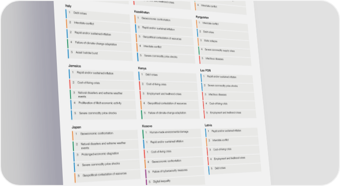 TABLE B.2 Top five risks identified by the Executive Opinion Survey (EOS) Israel Jordan Kuwait 1 Cost-of-living crisis 1 Debt crises 1 Rapid and/or sustained inflation 2 Terrorist attacks 2 Severe commodity supply crises 1 Cost-of-living crisis 3 Interstate conflict 2 Cost-of-living crisis 3 Severe commodity price shocks 4 Geoeconomic confrontation 4 Severe commodity price shocks 4 Human-made environmental damage 5 Asset bubble burst 5 Employment and livelihood crises 4 Interstate conflict Italy Kazakhstan Kyrgyzstan 1 Debt crises 1 Geoeconomic confrontation 1 Interstate conflict 2 Interstate conflict 2 Rapid and/or sustained inflation 2 Debt crises 2 Rapid and/or sustained inflation 3 Geopolitical contestation of resources 3 State collapse 4 Failure of climate-change adaptation 4 Interstate conflict 4 Severe commodity supply crises 5 Asset bubble burst 5 Severe commodity price shocks 5 Infectious diseases Jamaica Kenya Lao PDR 1 Rapid and/or sustained inflation 1 Debt crises 1 Rapid and/or sustained inflation 2 Cost-of-living crisis 2 Cost-of-living crisis 2 Severe commodity price shocks 3 Natural disasters and extreme weather 3 Employment and livelihood crises 3 Infectious diseases events 4 Proliferation of illicit economic activity 4 Geopolitical contestation of resources 4 Cost-of-living crisis 5 Severe commodity price shocks 5 Failure of climate-change adaptation 5 Employment and livelihood crises Japan Kosovo Latvia 1 Geoeconomic confrontation 1 Human-made environmental damage 1 Rapid and/or sustained inflation 2 Natural disasters and extreme weather 1 Rapid and/or sustained inflation 2 Interstate conflict events 3 Prolonged economic stagnation 1 Cost-of-living crisis 3 Cost-of-living crisis 4 Severe commodity price shocks 4 Geoeconomic confrontation 4 Employment and livelihood crises 5 Geopolitical contestation of resources 5 Failure of cybersecurity measures 5 Debt crises 5 Digital inequality Risk categories Economic Environmental Geopolitical Societal Technological Global Risks Report 2023 84