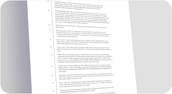 Endnotes 20. Leruth, Luc, Adnan Mazarei, Pierre Régibeau and Luc Renneboog, 22-12 Green Energy Depends on Critical Minerals. Who Controls the Supply Chains?, Peterson Institute for International Economics, https://www.piie.com/publications/working-papers/green-energy-depends-critical-minerals-who- controls-supply-chains. 21. Dempsey, Harry, “Rio Tinto warns of excess globalisation in supply chains for critical metals”, Financial Times, 11 October 2022, https://www.ft.com/content/6da95eb8-6def-43a9-9eb0-8a026781c31c?deskt op=true&segmentId=7c8f09b9-9b61-4fbb-9430-9208a9e233c8#myft:noti昀椀cation:daily-email:content. 22. US Department of the Interior US Geological Survey, Mineral Commodity Summaries 2022, 31 January 2022, https://pubs.usgs.gov/periodicals/mcs2022/mcs2022.pdf. 23. Ibid. 24. Sevastopulo, Demetri and Edward White, “Canada orders Chinese companies to divest stakes in lithium mines”, Financial Times, 3 November 2022, https://www.ft.com/content/6ca9a470- 59ee-4809-8a5b-35f6073c9907?desktop=true&segmentId=7c8f09b9-9b61-4fbb-9430- 9208a9e233c8#myft:noti昀椀cation:daily-email:content. 25. International Energy Agency (IEA), World Energy Outlook Special Report: The Role of Critical Minerals in Clean Energy Transitions, https://www.iea.org/reports/the-role-of-critical-minerals-in-clean-energy- transitions, 2022; US Geological Survey, Mineral Commodity Summaries 2022: Nickel, https://pubs.usgs. gov/periodicals/mcs2022/mcs2022-nickel.pdf; Lithium, https://pubs.usgs.gov/periodicals/mcs2022/ mcs2022-lithium.pdf; Platinum Group Metals, https://pubs.usgs.gov/periodicals/mcs2022/mcs2022- platinum.pdf; Cobalt, https://pubs.usgs.gov/periodicals/mcs2022/mcs2022-cobalt.pdf; Graphite, https:// pubs.usgs.gov/periodicals/mcs2022/mcs2022-graphite.pdf. 26. Wilson Center, Critical Mineral Maps, 17 March 2022, https://www.wilsoncenter.org/article/critical- mineral-maps. 27. Natural Resources Canada, Joint Statement by Canada’s Minister of Natural Resources and the European Commissioner for Internal Market, 19 July 2021, https://www.canada.ca/en/natural-resources- canada/news/2021/07/joint-statement-by-canadas-minister-of-natural-resources-and-the-european- commissioner-for-internal-market.html. 28. Bond, David E., Francisco de Rosenzweig and Samuel Scoles, “Mexico nationalizes lithium; sets up state-owned company”, White & Case, 9 September 2022, https://www.whitecase.com/insight-alert/ mexico-nationalizes-lithium-sets-state-owned-company. 29. O’Kane, Sean, “Tesla con昀椀rms plans to build lithium re昀椀nery in Texas”, Bloomberg, 20 October 2022, https://www.bloomberg.com/news/articles/2022-10-19/tesla-con昀椀rms-plans-to-build-lithium-re昀椀nery-in- texas. 30. KPMG, Resourcing the Energy Transition: Making the World Go Round, 2021, https://assets.kpmg/ content/dam/kpmg/xx/pdf/2021/03/resourcing-the-energy-transition.pdf; Dempsey, Harry and Mercedes Ruehl, “Indonesia considers Opec-style cartel for battery metals”, Financial Times, 31 October 2022, https://www.ft.com/content/0990f663-19ae-4744-828f-1bd659697468?desktop=true&segmentId=7c8f 09b9-9b61-4fbb-9430-9208a9e233c8#myft:noti昀椀cation:daily-email:content. 31. Schipani, Andres, “How the DRC became the battleground of a proxy war over precious resources”, Financial Times, 27 October 2022, https://www.ft.com/content/26125730-3113-4946-982a-989e2ac be472?desktop=true&segmentId=7c8f09b9-9b61-4fbb-9430-9208a9e233c8#myft:noti昀椀cation:daily- email:content. 32. Kyodo News, China ship with largest-ever cannon enters Japan waters near Senkakus, 25 November 2022, https://english.kyodonews.net/news/2022/11/cf16e72c5cb6-china-ship-with-largest-ever-cannon- enters-japan-waters-near-senkakus.html. 33. Pugh, T.A.M., et al.,“Climate analogues suggest limited potential for intensi昀椀cation of production on current croplands under climate change”, Nature Communications, vol. 7, no. 12608, 20 September 2016, https://www.nature.com/articles/ncomms12608. 34. Al-Monitor, Egypt warns of stalemate in Nile dam dispute, 27 September 2022, https://www.al-monitor. com/originals/2022/09/egypt-warns-stalemate-nile-dam-dispute. 35. Ashraf, Tamanna and Shlomi Dinar, “Dams, Terrorism and Water Nationalism’s Response to Globalization and Development: The Case of South Asia”, Terrorism and Political Violence, vol. 34, no. 5, 3 June 2022, pp. 958-978, https://www.tandfonline.com/doi/abs/10.1080/09546553.2022.2069449. 36. UN Water, The United Nations Water Development Report 2022: Groundwater: Making the Invisible Visible, 21 March 2022. Global Risks Report 2023 68
