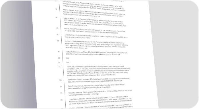 Endnotes 39. Statistica Research Department, U.S. health expenditure as percent of GDP 1960-2020, 1 December 2022, https://www.statista.com/statistics/184968/us-health-expenditure-as-percent-of-gdp-since-1960/. 40. Hariharan, Kavitha, Adrienne Cernigoi and Jordan Lee,"Life Support: A People Prescription for Resilient Health Systems", Marsh McLennan, 2022, https://www.marshmclennan.com/insights/publications/2022/ november/life-support-a-people-prescription-for-resilient-health-systems.html. 41. Singer, Merrill, “A dose of drugs, a touch of violence, a case of AIDS: conceptualising the SAVA syndemic”, Free Inquiry in Creative Sociology, vol. 24, no. 2, 1 May 1996. 42. McGowan, Victoria, “COVID-19 mortality and deprivation: a pandemic, syndemic and endemic health inequalities”, The Lancet Public Health, vol. 7, iss. 11, 1 November 2022; Mendenhall, Emily, Brandon A. Kohrt, Carmen H. Logie and Alexander Tsai, “Syndemics and clinical science”, Nature Medicine, vol. 28, 21 July 2022, pp. 1359-1362. 43. Schwartz, Sheree R., et al., "The immediate effect of the Same-Sex Marriage Prohibition Act on stigma, discrimination, and engagement on HIV prevention and treatment services in men who have sex with men in Nigeria: analysis of prospective data from the TRUST cohort”, The Lancet HIV, vol. 2, no. 7, 1 June 2015. 44. Marmot, Michael, “A generation of Britons face long-term illness from being cold and poor this winter”, The Guardian, 1 September 2022, https://www.theguardian.com/commentisfree/2022/sep/01/generation- britain-long-term-illness-cold-poor-winter-cost-of-living-crisis. 45. Lazarus, Jeffrey V., et. al., “Revisiting COVID-19 Vaccine Hesitancy around the World Using Data from 23 Countries in 2021”, Nature Communications, vol. 13, July 1, 2022. Bhanani, L. Y. and B. Franz, “A meta-analysis of COVID-19 vaccine attitudes and demographic characteristics in the United States”, Public Health, vol. 27, June 2022, pp 31-38. 46. Kuchler, Hannah,“Revolutionary Crispr gene editing speeds from lab to treatment room”, Financial Times, 19 August 2022, https://www.ft.com/content/e3c12117-190c-4fc9-9988-57eb9ab9de56. 47. United Nations, UN condemns brutal killing of eight polio workers in Afghanistan, 24 February 2022, https:// news.un.org/en/story/2022/02/1112612. 48. Institute for Health Metrics and Evaluation (IHME), The Lancet: Latest global disease estimates reveal perfect storm of rising chronic diseases and public health failures fuelling COVID-19 pandemic, 15 October 2020, https://www.healthdata.org/news-release/lancet-latest-global-disease-estimates-reveal-perfect- storm-rising-chronic-diseases-and. 49. Institute for Economics and Peace (IEP), Global Peace Index 2022: Measuring peace in a complex world, 2022, https://www.visionofhumanity.org/wp-content/uploads/2022/06/GPI-2022-web.pdf. 50. Ibid. 51. Ibid. 52. Mason, Ra, “Commentary: Japan’s Militarisation Gets a Boost from Ukraine War despite Paci昀椀st Constitution”, CNA, 17 May 2022, https://www.channelnewsasia.com/commentary/japan-increase-military- spending-paci昀椀st-constitution-ukraine-china-2687661; Stockholm International Peace Research Institute (SIPRI), World Military Expenditure Passes $2 Trillion for First Time, 25 April 2022, https://www.sipri.org/ media/press-release/2022/world-military-expenditure-passes-2-trillion-昀椀rst-time. 53. Institute for Economics and Peace (IEP), Global Peace Index 2022: Measuring peace in a complex world, 2022, https://www.visionofhumanity.org/wp-content/uploads/2022/06/GPI-2022-web.pdf. 54. Perlo-Freeman, Samuel, Rethinking Unconstrained Military Spending, United Nations Of昀椀ce for Disarmament Affairs, UNODA Occasional Papers, No. 35, April 2020. 55. Carafano, James Jay, “Rapid Advancements in Military Tech.” GIS Reports (blog), 19 January 2022, https:// www.gisreportsonline.com/r/military-technology/. 56. United Nations Education Scienti昀椀c Culture Organization (UNESCO), Launch of the 2022 Survey of Research and Experimental Development Statistics for SDG 9.5 [Press release], 6 September 2022, http:// uis.unesco.org/en/news/launch-2022-survey-research-and-experimental-development-statistics-sdg-9-5. 57. Cerdeiro, Diego, et al., “Sizing Up the Effects of Technological Decoupling”, International Monetary Fund, IMF Working Papers, 12 March 2021, https://www.imf.org/en/Publications/WP/Issues/2021/03/12/Sizing- Up-the-Effects-of-Technological-Decoupling-50125. 58. Congressional Research Service, Global Research and Development Expenditure: Fact Sheet, 14 September 2022, https://sgp.fas.org/crs/misc/R44283.pdf. 59. North Atlantic Treaty Organization (NATO), NATO leaders meet with key partners to address global challenges, Indo-Paci昀椀c partners participate in a NATO summit for the 昀椀rst time [Press release], 29 June 2022, https://www.nato.int/cps/en/natohq/news_197287.htm. 60. McCarthy, Simone, “China and Cambodia break ground at naval base in show of ‘iron-clad’ relations”, CNN, 9 June 2022, https://edition.cnn.com/2022/06/09/asia/china-cambodia-naval-base-military-intl-hnk/ index.html. 61. Muggah, Robert, “The war against Ukraine has reached outer space”, iPolitics, 17 March 2022, https:// www.ipolitics.ca/opinions/the-war-against-ukraine-has-reached-outer-space. Global Risks Report 2023 52