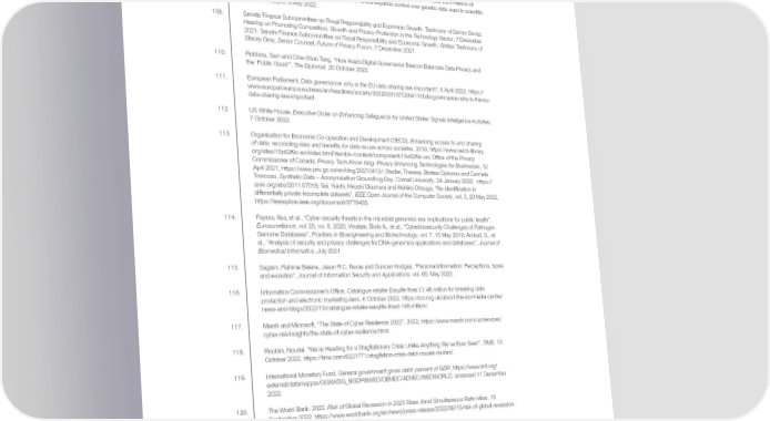 Endnotes 105. Silic, Anamaria, “Pegasus Spyware Used against Dozens of Activist Women in the Middle East”, The Intercept, January 18, 2022. https://theintercept.com/2022/01/18/pegasus-spyware-nso-group-women- activists-journalists/. 106. CIPESA, State of Internet Freedom in Africa 2022: The Rise of Biometric Surveillance, September 2022, http://104.152.168.205/~cipesa/old/?wpfb_dl=505. 107. Hoster, Ben, Swati Khurana and Rachel Juay, “Still Buffering: Time for a Smart City Reboot”, Marsh McLennan, October 2022, https://www.marshmclennan.com/insights/publications/2022/october/still- buffering-time-for-a-smart-city-reboot.html. 108. Das, Shanti and Vincent Ni, “Fears over China’s access to genetic data of UK citizens”, The Guardian, 20 August 2022; Needham, Kirsty and Clare Baldwin, “China’s gene giant harvests data from millions of women”, Reuters, 7 July 2021; Mallapaty, Smriti, “China expands control over genetic data used in scienti昀椀c research”, Nature, 6 May 2022. 109. Senate Finance Subcommittee on Fiscal Responsibility and Economic Growth, Testimony of Samm Sacks: Hearing on Promoting Competition, Growth and Privacy Protection in the Technology Sector, 7 December 2021; Senate Finance Subcommittee on Fiscal Responsibility and Economic Growth, Written Testimony of Stacey Gray, Senior Counsel, Future of Privacy Forum, 7 December 2021. 110. Robbins, Sam and Chia-Shuo Tang, “How Asia’s Digital Governance Beacon Balances Data Privacy and the ‘Public Good’”, The Diplomat, 20 October 2022. 111. European Parliament, Data governance: why is the EU data sharing law important?, 6 April 2022, https:// www.europarl.europa.eu/news/en/headlines/society/20220331STO26411/data-governance-why-is-the-eu- data-sharing-law-important. 112. US White House, Executive Order on Enhancing Safeguards for United States Signals Intelligence Activities, 7 October 2022. 113. Organisation for Economic Co-operation and Development (OECD), Enhancing access to and sharing of data: reconciling risks and bene昀椀ts for data re-use across societies, 2019, https://www.oecd-ilibrary. org/sites/15c62f9c-en/index.html?itemId=/content/component/15c62f9c-en; Of昀椀ce of the Privacy Commissioner of Canada, Privacy Tech-Know blog: Privacy Enhancing Technologies for Businesses, 12 April 2021, https://www.priv.gc.ca/en/blog/20210412/; Stadler, Theresa, Bristea Oprisanu and Carmela Troncoso, Synthetic Data – Anonymisation Groundhog Day, Cornell University, 24 January 2022, https:// arxiv.org/abs/2011.07018; Sei, Yuichi, Hiroshi Okumura and Akihiko Ohsuga, “Re-identi昀椀cation in differentially private incomplete datasets”, IEEE Open Journal of the Computer Society, vol. 3, 20 May 2022, https://ieeexplore.ieee.org/document/9779455. 114. Fayans, Iliya, et al., “Cyber security threats in the microbial genomics era: implications for public health”, Eurosurvellance, vol. 25, no. 6, 2020; Vinatzer, Boris A., et al., “Cyberbiosecurity Challenges of Pathogen Genome Databases”, Frontiers in Bioengineering and Biotechnology, vol. 7, 15 May 2019; Arshad, S., et al., “Analysis of security and privacy challenges for DNA-genomics applications and databases”, Journal of Biomedical Informatics, July 2021. 115. Saglam, Rahime Belene, Jason R.C. Nurse and Duncan Hodges, “Personal information: Perceptions, types and evolution”, Journal of Information Security and Applications, vol. 66, May 2022. 116. Information Commissioner’s Of昀椀ce, Catalogue retailer Easylife 昀椀nes £1.48 million for breaking data protection and electronic marketing laws, 6 October 2022, https://ico.org.uk/about-the-ico/media-centre/ news-and-blogs/2022/10/catalogue-retailer-easylife-昀椀ned-148-million/. 117. Marsh and Microsoft, “The State of Cyber Resilience 2022”, 2022, https://www.marsh.com/us/services/ cyber-risk/insights/the-state-of-cyber-resilience.html. 118. Roubini, Nouriel, “We’re Heading for a Stag昀氀ationary Crisis Unlike Anything We’ve Ever Seen”, TIME, 13 October 2022, https://time.com/6221771/stag昀氀ation-crisis-debt-nouriel-roubini/. 119. International Monetary Fund, General government gross debt: percent of GDP, https://www.imf.org/ external/datamapper/GGXWDG_NGDP@WEO/OEMDC/ADVEC/WEOWORLD, accessed 11 December 2022. 120. The World Bank. 2022. Risk of Global Recession in 2023 Rises Amid Simultaneous Rate Hikes. 15 September 2022. https://www.worldbank.org/en/news/press-release/2022/09/15/risk-of-global-recession- in-2023-rises-amid-simultaneous-rate-hikes 121. Ibid. 122. Pazarbasioglu, Ceyla and Carmen Reinhart, “Shining a light on debt”, International Monetary Fund (IMF). March 2022. https://www.imf.org/en/Publications/fandd/issues/2022/03/Shining-a-light-on-debt- Pazarbasioglu-Reinhart. 123. Subran, Ludovic, “Reverse Currency War Is Hitting Emerging Markets Hard”, South China Morning Post, October 20, 2022, https://www.scmp.com/comment/opinion/article/3196468/federal-reserves-in昀氀ation- 昀椀ght-leaves-emerging-markets-scrambling-answers. 124. Allianz, “Reverse currency war puts emerging markets at risk”, 29 September 2022, https://www. allianz-trade.com/en_global/news-insights/economic-insights/emerging-markets-debt-sustainability-risks. html. Global Risks Report 2023 55
