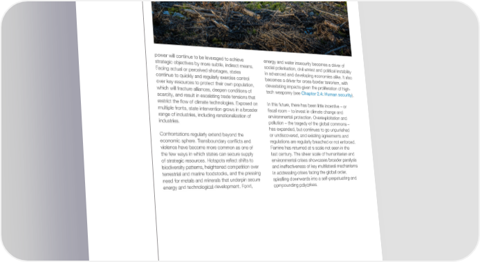 power will continue to be leveraged to achieve energy and water insecurity becomes a driver of strategic objectives by more subtle, indirect means. social polarisation, civil unrest and political instability Facing actual or perceived shortages, states in advanced and developing economies alike. It also continue to quickly and regularly exercise control becomes a driver for cross-border terrorism, with over key resources to protect their own population, devastating impacts given the proliferation of high- which will fracture alliances, deepen conditions of tech weaponry (see Chapter 2.4: Human security). scarcity, and result in escalating trade tensions that restrict the 昀氀ow of climate technologies. Exposed on In this future, there has been little incentive – or multiple fronts, state intervention grows in a broader 昀椀scal room – to invest in climate change and range of industries, including renationalization of environmental protection. Overexploitation and industries. pollution – the tragedy of the global commons – has expanded, but continues to go unpunished Confrontations regularly extend beyond the or undiscovered, and existing agreements and economic sphere. Transboundary con昀氀icts and regulations are regularly breached or not enforced. violence have become more common as one of Famine has returned at a scale not seen in the the few ways in which states can secure supply last century. The sheer scale of humanitarian and of strategic resources. Hotspots re昀氀ect shifts to environmental crises showcases broader paralysis biodiversity patterns, heightened competition over and ineffectiveness of key multilateral mechanisms terrestrial and marine foodstocks, and the pressing in addressing crises facing the global order, need for metals and minerals that underpin secure spiralling downwards into a self-perpetuating and energy and technological development. Food, compounding polycrises. Global Risks Report 2023 66