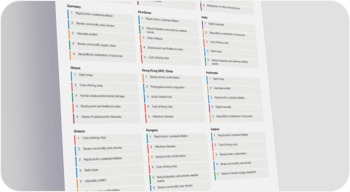 TABLE B.2 Top five risks identified by the Executive Opinion Survey (EOS) Georgia Guatemala Hungary 1 Cost-of-living crisis 1 Natural disasters and extreme weather 1 Rapid and/or sustained inflation events 2 Interstate conflict 2 Collapse of services and public 2 Cost-of-living crisis infrastructure 3 Geoeconomic confrontation 3 Prolonged economic stagnation 3 Asset bubble burst 3 Digital power concentration 4 State collapse 4 Natural disasters and extreme weather events 5 Rapid and/or sustained inflation 5 Digital inequality 4 Breakdown of critical infrastructure Germany Honduras India 1 Rapid and/or sustained inflation 1 Rapid and/or sustained inflation 1 Digital inequality 2 Severe commodity price shocks 2 Natural disasters and extreme weather 2 Geopolitical contestation of resources events 3 Interstate conflict 3 State collapse 3 Cost-of-living crisis 4 Severe commodity supply crises 4 Employment and livelihood crises 4 Debt crises 4 Geopolitical contestation of resources 5 Cost-of-living crisis 5 Natural disasters and extreme weather events Ghana Hong Kong SAR, China Indonesia 1 Debt crises 1 Geoeconomic confrontation 1 Debt crises 2 Cost-of-living crisis 2 Prolonged economic stagnation 2 Interstate conflict 3 Human-made environmental damage 3 Asset bubble burst 2 Rapid and/or sustained inflation 4 Employment and livelihood crises 4 Cost-of-living crisis 4 Digital inequality 5 Failure of cybersecurity measures 5 Infectious diseases 5 Geopolitical contestation of resources Greece Hungary Ireland 1 Cost-of-living crisis 1 Rapid and/or sustained inflation 1 Rapid and/or sustained inflation 2 Severe commodity price shocks 2 Infectious diseases 2 Cost-of-living crisis 2 Rapid and/or sustained inflation 3 Geoeconomic confrontation 3 Geoeconomic confrontation 4 Debt crises 4 Cost-of-living crisis 4 Severe commodity price shocks 5 Interstate conflict 5 Natural disasters and extreme weather 5 Failure of climate-change adaptation events 5 Geoeconomic confrontation 5 Severe commodity price shocks Risk categories Economic Environmental Geopolitical Societal Technological Global Risks Report 2023 83