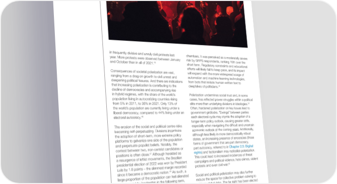 in frequently divisive and unruly civil protests last chambers. It was perceived as a moderately severe year. More protests were observed between January risk by GRPS respondents, ranking 16th over the 45 and October than in all of 2021. short term. Regulatory constraints and educational efforts will likely fail to keep pace, and its impact Consequences of societal polarization are vast, will expand with the more widespread usage of ranging from a drag on growth to civil unrest and automation and machine-learning technologies, deepening political 昀椀ssures. And there are indications from bots that imitate human-written text to that increasing polarization is contributing to the deepfakes of politicians.51 decline of democracies and accompanying rise in hybrid regimes, with the share of the world’s Polarization undermines social trust and, in some population living in autocratizing countries rising cases, has re昀氀ected power struggles within a political 52 from 5% in 2011, to 36% in 2021. Only 13% of elite more than underlying divisions in ideologies. the world’s population are currently living under a Often, hardened polarization on key issues lead to liberal democracy, compared to 44% living under an government gridlocks. "Swings" between parties 46 electoral autocracy. each electoral cycle may stymie the adoption of a longer-term policy outlook, causing greater strife, The erosion of the social and political centre risks especially when navigating the dif昀椀cult and uncertain becoming self-perpetuating. Divisions incentivize economic outlook of the coming years. Additionally, the adoption of short-term, more extreme policy although less likely in more democratically robust platforms to galvanize one side of the population states, an increasing presence of anocracies (those and perpetuate populist beliefs. Notably, the forms of government that are part democracy, contest between two, non-centrist candidates or part autocracy, referred to in Chapter 2.5: Digital 47 positions is often close. Although heralded as rights) and factionalism may radicalize polarization. a resurgence of leftist movements, the Brazilian This could lead to increased incidences of threat presidential election of 2022 was won by President campaigns and political violence, hate crimes, violent Lula by 1.8 points – the slimmest margin recorded protests and even civil war.53 48 since it became a democratic nation. As such, a large proportion of the population can feel alienated Social and political polarization may also further and angered by leadership in the following term, reduce the space for collective problem-solving to acting as a multiplier to existing societal concerns address global risks. The far right has been elected and civil unrest. This is further ampli昀椀ed by social in Italy and are now the second largest party in media, which increases polarization and distrust in Sweden, while the left has resurged in Latin America. 49 institutions alongside political engagement. National elections will take place in several G20 countries within the next two years, including the “Misinformation and disinformation” are, United States of America, South Africa, Türkiye, together, a potential accelerant to the erosion of Argentina, Mexico and Indonesia. The election of social cohesion as well as a consequence. With less-centrist leaders and adoption of more “extreme” the potential to destabilize trust in information and policies in economic superpowers may fracture 50 political processes, it has become a prominent tool alliances, limit global collaboration and lead to a for geopolitical agents to propagate extremist beliefs more volatile dynamic. and sway elections through social media echo Global Risks Report 2023 24