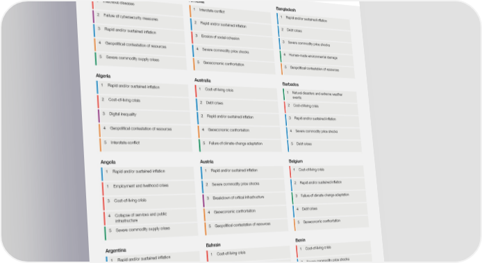 Figure B.2 presents the top 昀椀ve risks for each of the “Risk 1” indicates the most frequently selected 121 economies surveyed. risk in each economy. Tied risks are presented in alphabetical order, with the tie indicated by Over 12,000 respondents were presented with the numbering. For example, in Angola, two risks (“Rapid following question: “Which 昀椀ve risks are the most and/or sustained in昀氀ation” and “Employment and likely to pose the biggest threat to your country in livelihood crises”) are tied for 昀椀rst place and there is, the next two years?” and were asked to select these therefore, no risk listed in second place. from a list of 35 risks. TABLE B.2 Top five risks identified by the Executive Opinion Survey (EOS) Albania Armenia Bangladesh 1 Infectious diseases 1 Interstate conflict 1 Rapid and/or sustained inflation 2 Failure of cybersecurity measures 2 Rapid and/or sustained inflation 2 Debt crises 3 Rapid and/or sustained inflation 3 Erosion of social cohesion 3 Severe commodity price shocks 4 Geopolitical contestation of resources 4 Severe commodity price shocks 4 Human-made environmental damage 5 Severe commodity supply crises 5 Geoeconomic confrontation 5 Geopolitical contestation of resources Algeria Australia Barbados 1 Rapid and/or sustained inflation 1 Cost-of-living crisis 1 Natural disasters and extreme weather events 2 Cost-of-living crisis 2 Debt crises 2 Cost-of-living crisis 3 Digital inequality 2 Rapid and/or sustained inflation 3 Rapid and/or sustained inflation 4 Geopolitical contestation of resources 4 Geoeconomic confrontation 4 Severe commodity price shocks 5 Interstate conflict 5 Failure of climate-change adaptation 5 Debt crises Angola Austria Belgium 1 Rapid and/or sustained inflation 1 Rapid and/or sustained inflation 1 Cost-of-living crisis 1 Employment and livelihood crises 2 Severe commodity price shocks 2 Rapid and/or sustained inflation 3 Cost-of-living crisis 3 Breakdown of critical infrastructure 3 Failure of climate-change adaptation 4 Collapse of services and public 4 Geoeconomic confrontation 4 Debt crises infrastructure 5 Severe commodity supply crises 5 Geopolitical contestation of resources 5 Geoeconomic confrontation Argentina Bahrain Benin 1 Rapid and/or sustained inflation 1 Cost-of-living crisis 1 Cost-of-living crisis 2 Debt crises 2 Debt crises 2 Severe commodity price shocks 2 Proliferation of illicit economic activity 3 Severe commodity price shocks 3 Employment and livelihood crises 4 State collapse 4 Prolonged economic stagnation 4 Rapid and/or sustained inflation 5 Severe commodity supply crises 4 Rapid and/or sustained inflation 5 Severe commodity supply crises Risk categories Economic Environmental Geopolitical Societal Technological Global Risks Report 2023 80