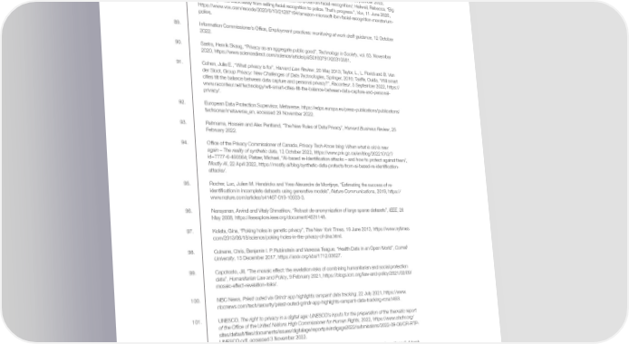 Endnotes 84. Robbins, Sam and Chia-Shuo Tang, “How Asia’s Digital Governance Beacon Balances Data Privacy and the ‘Public Good’”, The Diplomat, 20 October 2022. 85. The right to privacy is enshrined by Article 12 of the Universal Declaration on Human Rights. 86. Sætra, Henrik Skaug, “Privacy as an aggregate public good”, Technology in Society, vol. 63, November 2020, https://www.sciencedirect.com/science/article/pii/S0160791X20310381. 87. Organisation for Economic Co-operation and Development (OECD), Enhancing access to and sharing of data: reconciling risks and bene昀椀ts for data re-use across societies, 2020, https://www.oecd-ilibrary.org/ sites/15c62f9c-en/index.html?itemId=/content/component/15c62f9c-en. 88. Goujard, Clothilde, “Europe edges closer to a ban on facial recognition”, Politico, 20 September 2022, https://www.politico.eu/article/europe-edges-closer-to-a-ban-on-facial-recognition/; Heilweil, Rebecca, “Big tech companies back away from selling facial recognition to police. That’s progress.”, Vox, 11 June 2020, https://www.vox.com/recode/2020/6/10/21287194/amazon-microsoft-ibm-facial-recognition-moratorium- police. 89. Information Commissioner’s Of昀椀ce, Employment practices: monitoring at work draft guidance, 12 October 2022. 90. Sætra, Henrik Skaug, “Privacy as an aggregate public good”, Technology in Society, vol. 63, November 2020, https://www.sciencedirect.com/science/article/pii/S0160791X20310381. 91. Cohen, Julie E., “What privacy is for”, Harvard Law Review, 20 May 2013; Taylor, L., L. Floridi and B. Van der Sloot, Group Privacy: New Challenges of Data Technologies, Springer, 2016; Taaffe, Ouida, “Will smart cities tilt the balance between data capture and personal privacy?”, Raconteur, 5 September 2022, https:// www.raconteur.net/technology/will-smart-cities-tilt-the-balance-between-data-capture-and-personal- privacy/. 92. European Data Protection Supervisor, Metaverse, https://edps.europa.eu/press-publications/publications/ techsonar/metaverse_en, accessed 29 November 2022. 93. Rahnama, Hossein and Alex Pentland, “The New Rules of Data Privacy”, Harvard Business Review, 25 February 2022. 94. Of昀椀ce of the Privacy Commissioner of Canada, Privacy Tech-Know blog: When what is old is new again – The reality of synthetic data, 12 October 2022, https://www.priv.gc.ca/en/blog/20221012/? id=7777-6-493564; Platzer, Michael, “AI-based re-Identi昀椀cation attacks – and how to protect against them”, Mostly AI, 22 April 2022, https://mostly.ai/blog/synthetic-data-protects-from-ai-based-re-identi昀椀cation- attacks/. 95. Rocher, Luc, Julien M. Hendrickx and Yves-Alexandre de Montjoye, “Estimating the success of re- identi昀椀cation in incomplete datasets using generative models”, Nature Communications, 2019, https:// www.nature.com/articles/s41467-019-10933-3. 96. Narayanan, Arvind and Vitaly Shmatikov, “Robust de-anonymization of large sparse datasets”, IEEE, 28 May 2008, https://ieeexplore.ieee.org/document/4531148. 97. Kolata, Gina, “Poking holes in genetic privacy”, The New York Times, 16 June 2013, https://www.nytimes. com/2013/06/18/science/poking-holes-in-the-privacy-of-dna.html. 98. Culnane, Chris, Benjamin I. P. Rubinstein and Vanessa Teague, “Health Data in an Open World”, Cornell University, 15 December 2017, https://arxiv.org/abs/1712.05627. 99. Capotosto, Jill, “The mosaic effect: the revelation risks of combining humanitarian and social protection data”, Humanitarian Law and Policy, 9 February 2021, https://blogs.icrc.org/law-and-policy/2021/02/09/ mosaic-effect-revelation-risks/. 100. NBC News, Priest outed via Grindr app highlights rampant data tracking, 22 July 2021, https://www. nbcnews.com/tech/security/priest-outed-grindr-app-highlights-rampant-data-tracking-rcna1493. 101. UNESCO, The right to privacy in a digital age: UNESCO’s inputs for the preparation of the thematic report of the Of昀椀ce of the United Nations High Commissioner for Human Rights, 2022, https://www.ohchr.org/ sites/default/昀椀les/documents/issues/digitalage/reportprivindigage2022/submissions/2022-09-06/CFI-RTP- UNESCO.pdf, accessed 3 November 2022. 102. McKenna, Anne Toomey, “Customer Data Can Be Used As Evidence in Government Surveillance”, Marsh McLennan, 13 November 2022, https://www.brinknews.com/customer-data-can-be-used-as-evidence-in- government-surveillance/. 103. Senate Finance Subcommittee on Fiscal Responsibility and Economic Growth, Testimony of Samm Sacks: Hearing on Promoting Competition, Growth and Privacy Protection in the Technology Sector, 7 December 2021; Sherman, Justin, “The Open Data Market and Risks to National Security”, Lawfare, 3 February 2022, https://www.lawfareblog.com/open-data-market-and-risks-national-security; Cadell, Cate, “China harvests masses of data on western targets, documents show”, The Washington Post, 31 December 2021 ; Benson, Thor, “The Danger of License Plate Readers in Post-Roe America”, WIRED, 7 July 2022; Grant, Nico, “Google Says It Will Delete Location Data When Users Visit Abortion Clinics”, The New York Times,1 July 2022. 104. Collins, Barry, “Mission Impossible: 7 Countries Tell Facebook to Break Encryption”, Forbes, 11 October 2020. Global Risks Report 2023 54